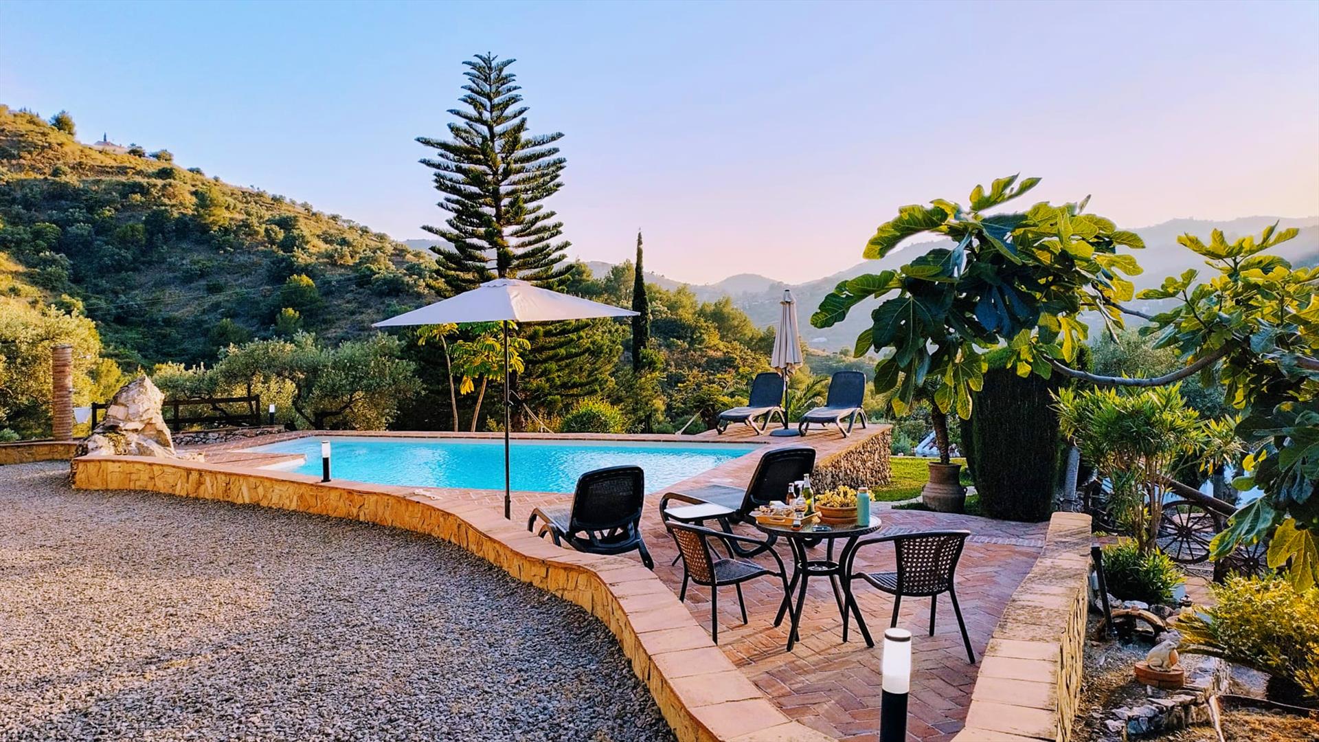 Rústico, privado y rural. Es la esencia de este sitio encantador que se encuentra a unos 10 minutos en coche de Frigiliana, un bonito paseo por las montañas. El acceso tiene algunas curvas pronunciadas pero no presenta dificultades y está todo hormigonado. El cortijo está situado en una amplia finca con varios rincones para sentarse en medio de amplio abanico de flores y plantas. Dispone de una atractiva zona de barbacoa y un sombreado porche con mobiliario de jardín. La zona de la piscina privada (7m x 4m) está situada en un nivel superior, donde se puede tomar el sol en una hamaca y disfrutar de las panorámicas vistas al pueblo de El Acebuchal, una aldea con una interesante historia. El pueblo, uno de los últimos reductos de los maquis, fue abandonado en 1949 forzado por el régimen de Franco. Los niños de aquellas familias que un día se fueron con lágrimas en los ojos soñaban con volver y verlo de nuevo como en sus mejores tiempos. Ese sueño se hizo realidad en 1998 cuando empezó la rehabilitación de la primera casa. Poco a poco se reconstruyó todo... Todavía no hay tiendas en este pueblo pero vale la pena visitar el único restaurante donde sirven platos locales de caza. En el pueblo de Frigiliana sí encontrará todo tipo de tiendas, supermercados, bares y restaurantes. Y los que buscan el mar, pueden darse un baño en una de las playas de Nerja, que queda a tan sólo 9 kilómetros, unos 15 minutos en coche.