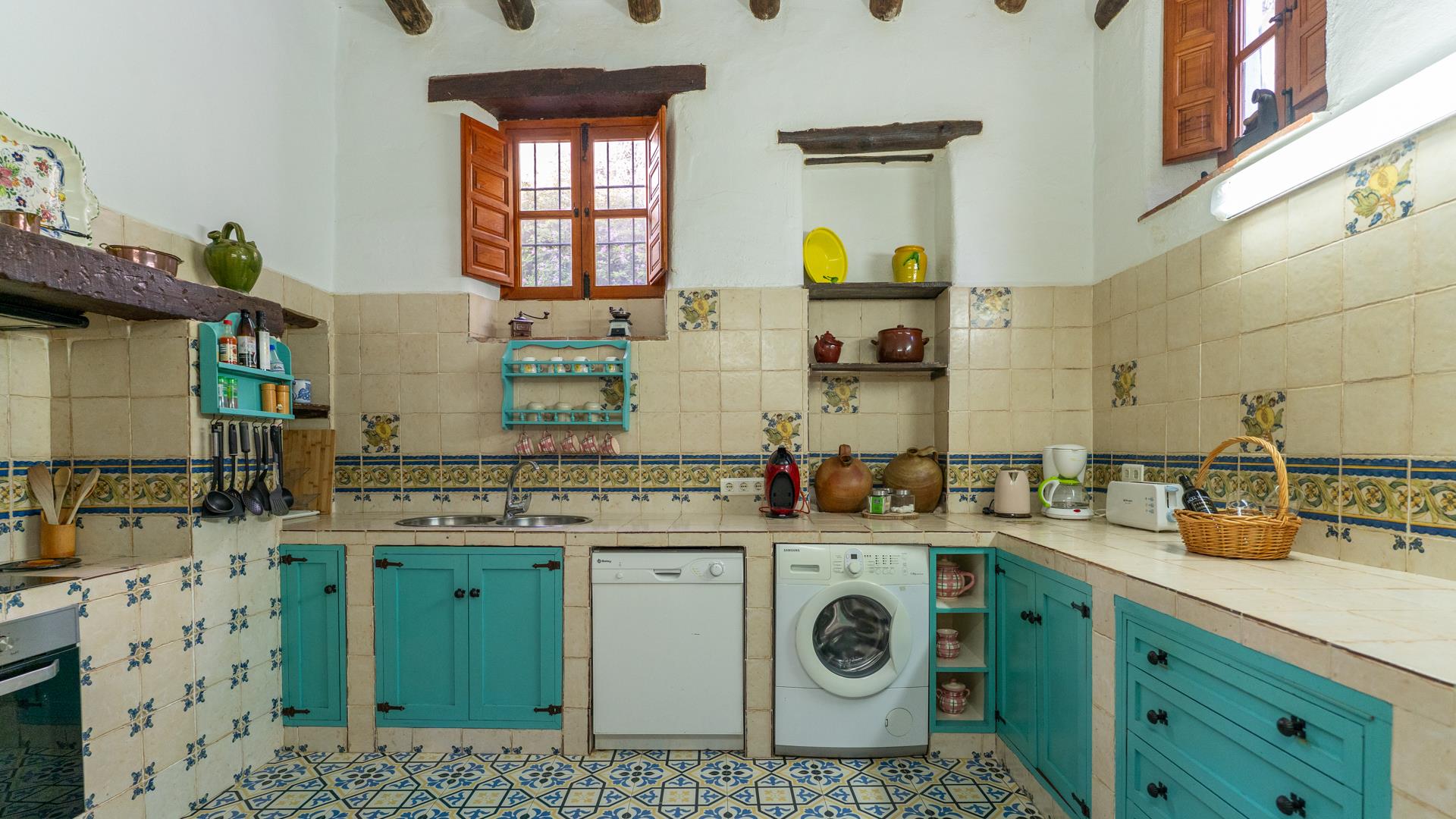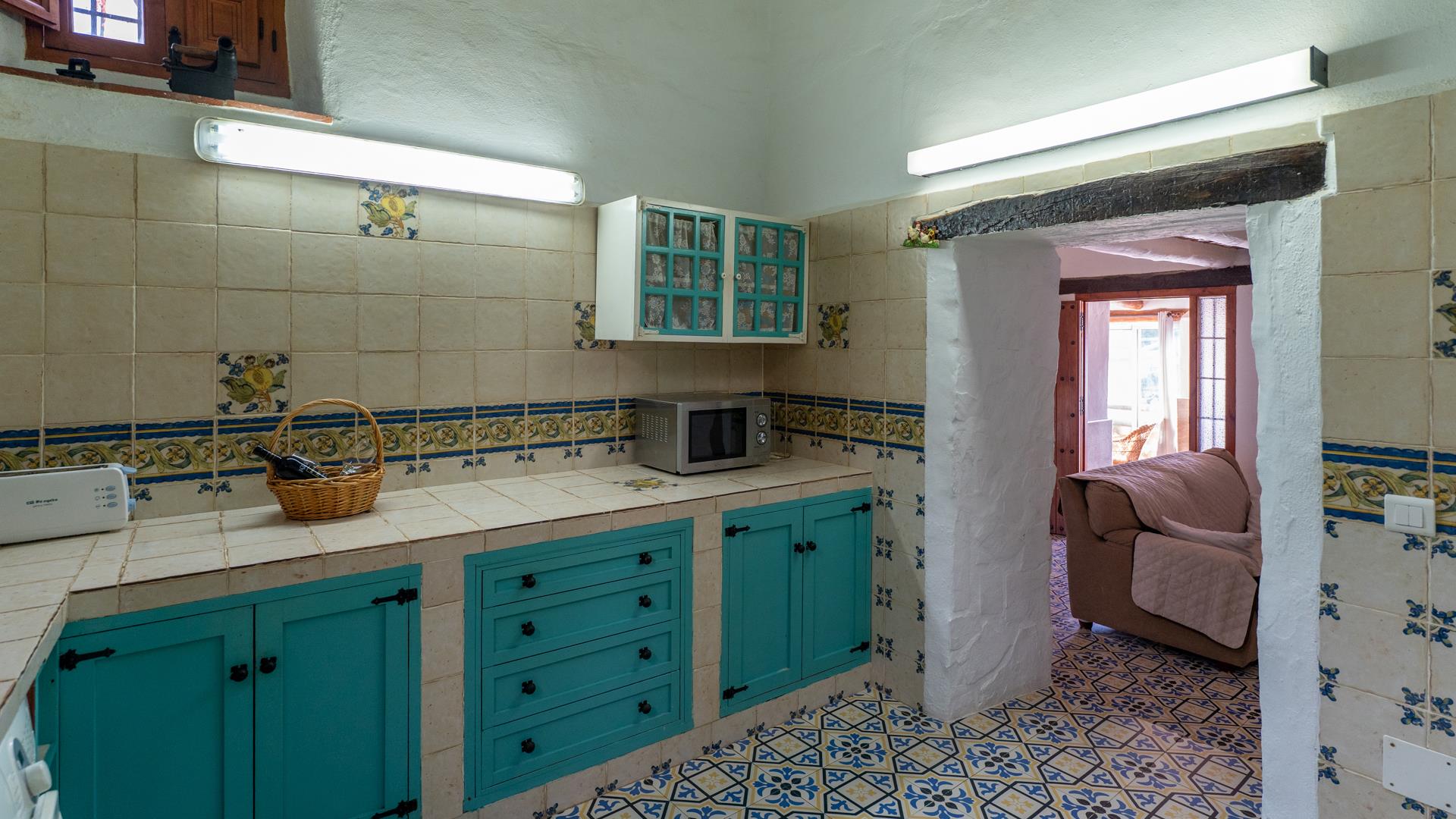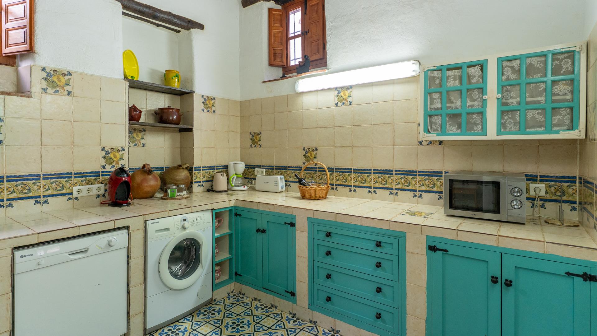 La cocina, decorada con azulejos andaluces tradicionales, está totalmente equipada con todas las comodidades modernas: frigorífico-congelador, horno, placa, microondas, lavavajillas, lavadora y todo tipo de utensilios, para que no le falte nada a la hora de preparar comidas caseras.