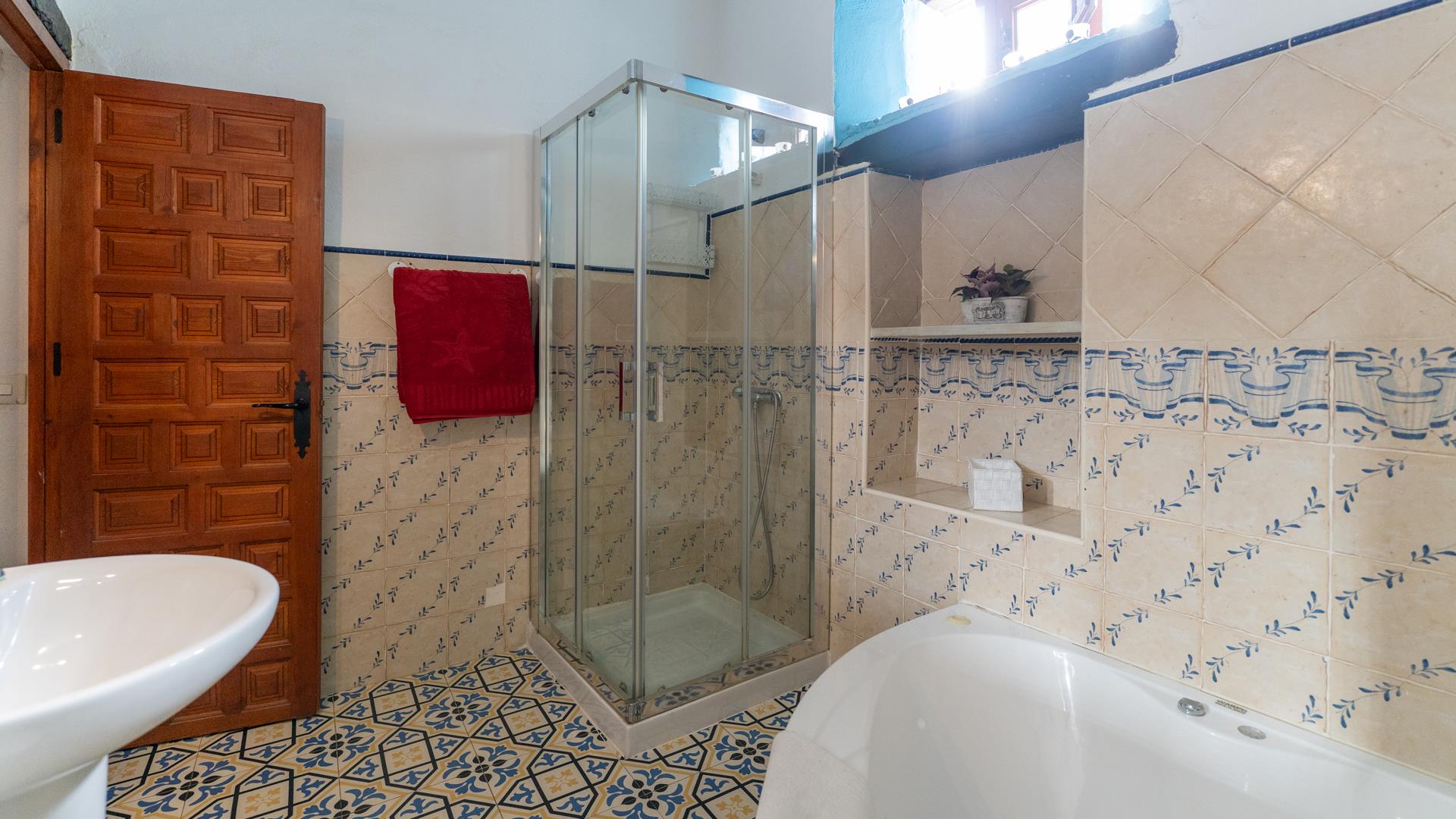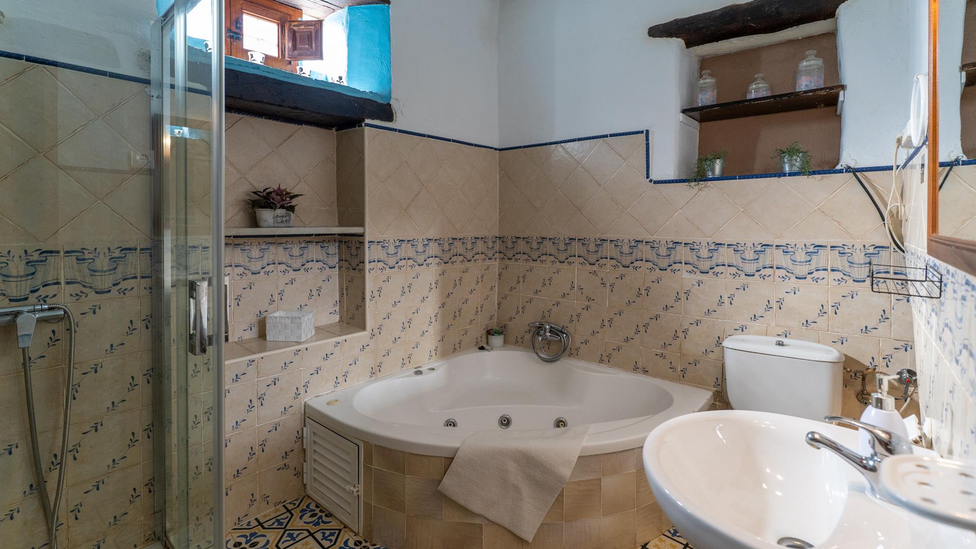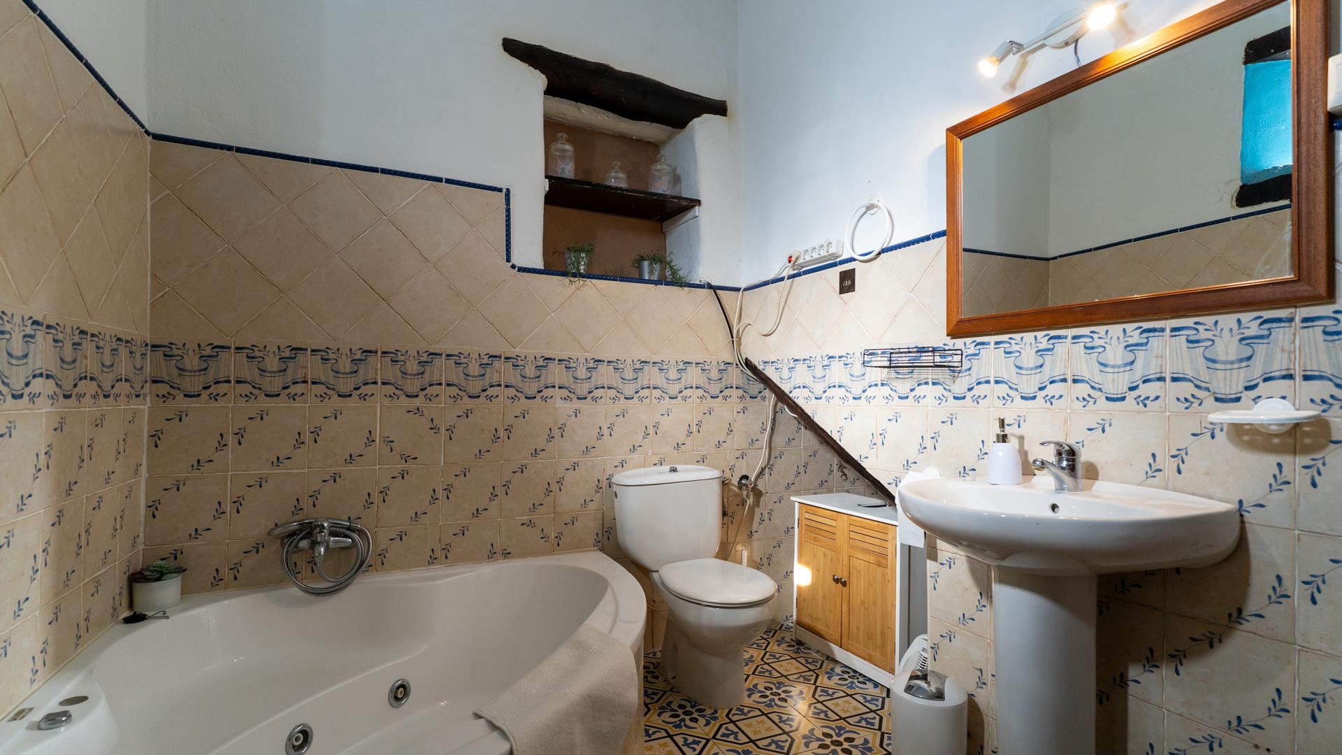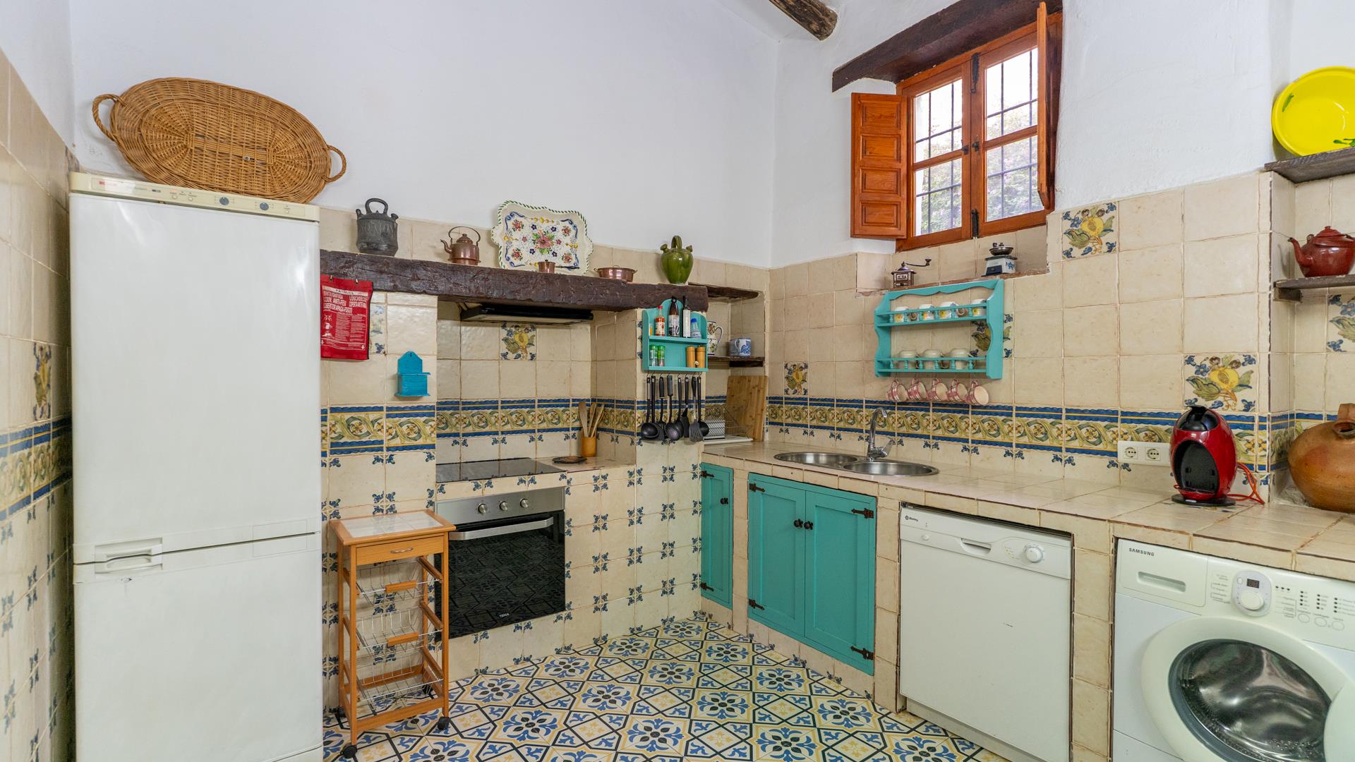 La cocina, decorada con azulejos andaluces tradicionales, está totalmente equipada con todas las comodidades modernas: frigorífico-congelador, horno, placa, microondas, lavavajillas, lavadora y todo tipo de utensilios, para que no le falte nada a la hora de preparar comidas caseras.