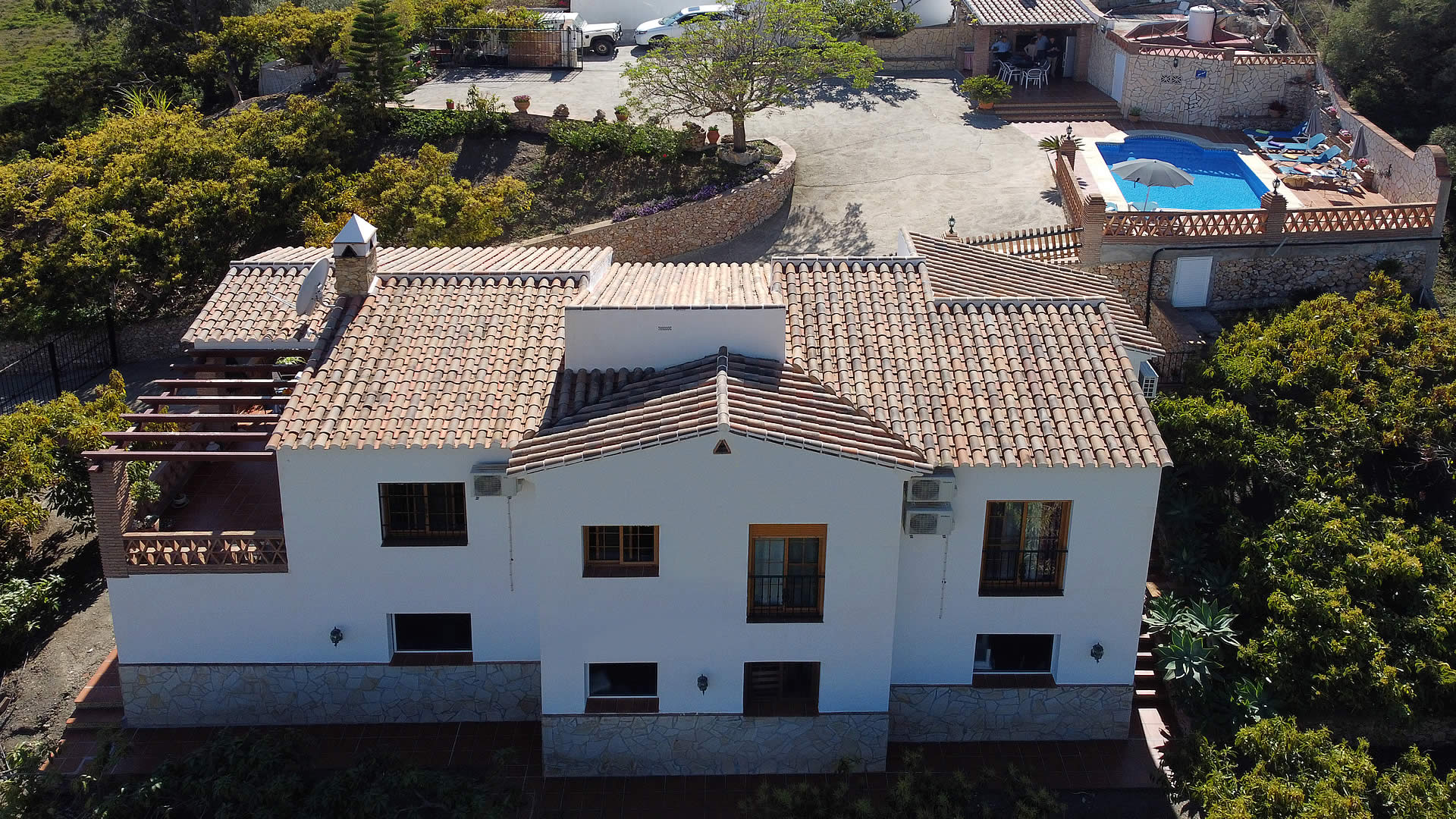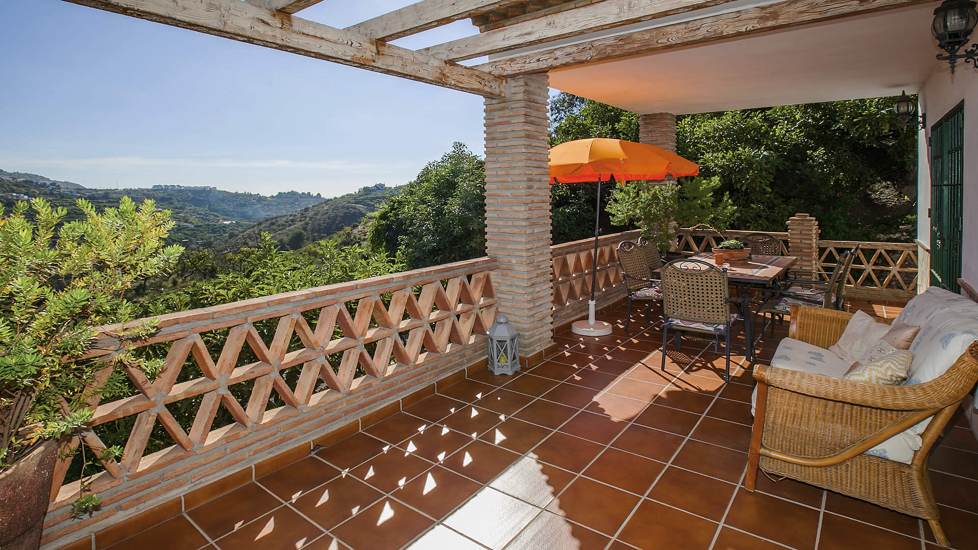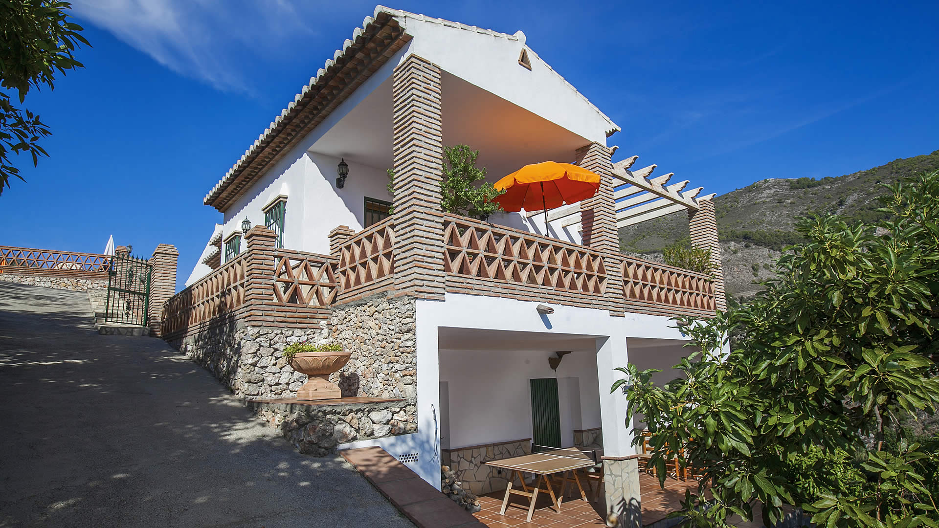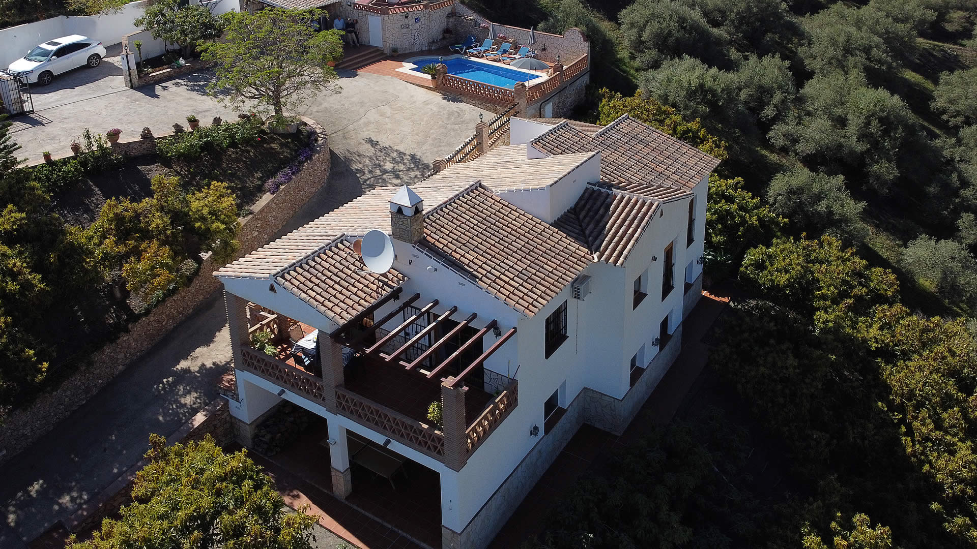 Esta villa de nueva construcción está situada en una colina frente al pueblo blanco de Frigiliana, rodeada de árboles de aguacate, y disfrutando de una ubicación muy tranquila. La zona exterior, con una barbacoa de obra y una piscina de buen tamaño (7m x 4m) con escalones romanos, se encuentra en un nivel superior a la casa y hay mucho espacio para tomar el sol mientras se disfruta de las impresionantes vistas sobre el campo y el pueblo. Dispone de tumbonas para esta zona. Junto a la sala de estar hay otra terraza para aquellos que buscan la sombra, provista de todo lo necesario para comer al aire libre, y desde la que también se tienen vistas. En coche, a la villa se accede por un camino de hormigón que tomamos desde la carretera de Frigiliana - Torrox, con algunos tramos empinados. Aunque no hay muchas curvas, le recomendamos utilizar un coche con al menos un motor de 1.400 cc.