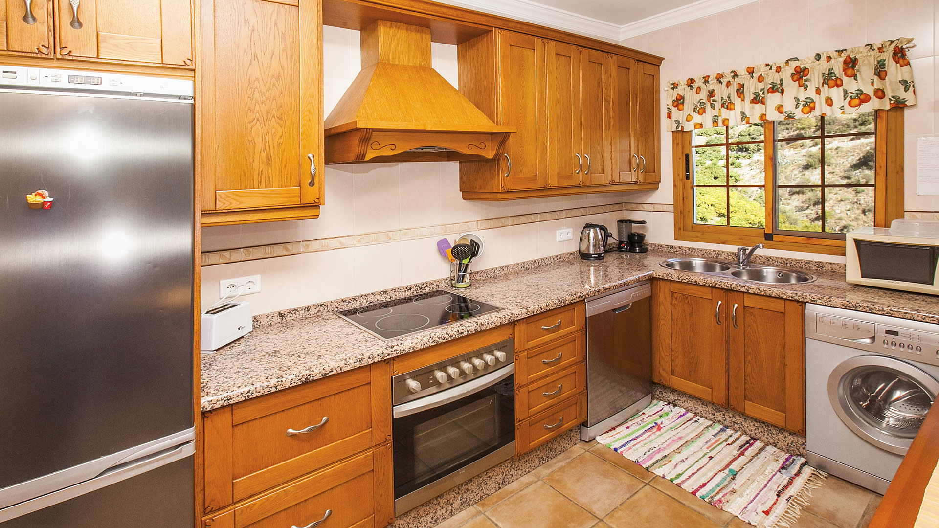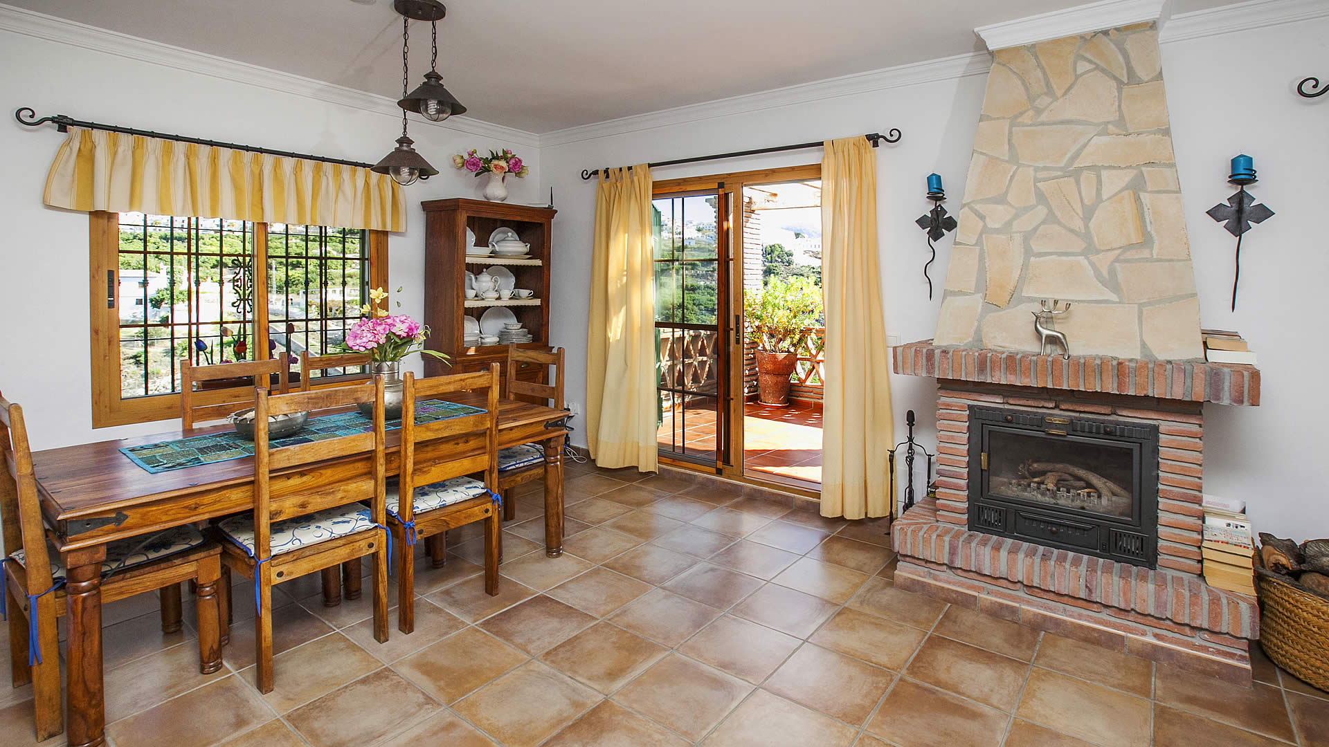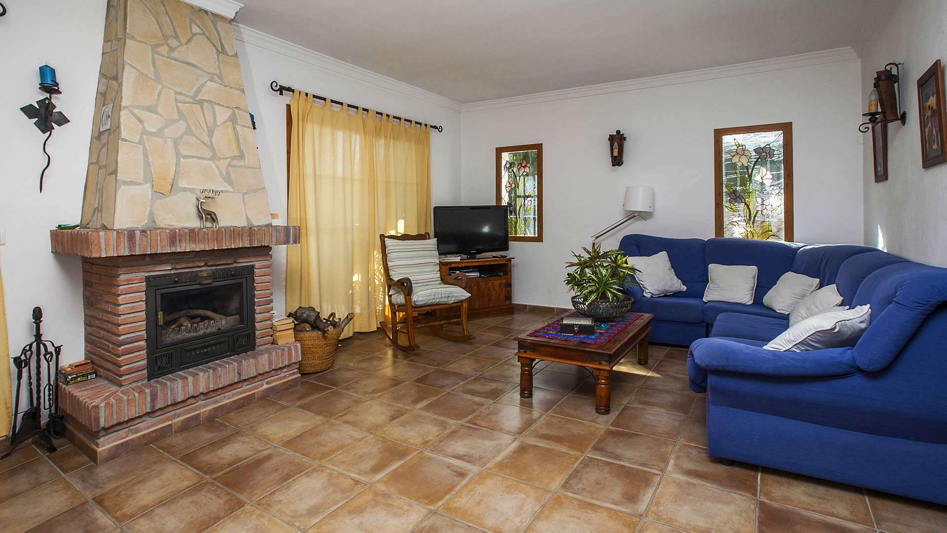 La zona de salón / comedor / cocina se organiza en un espacio abierto, confortable y acogedor, y disfruta de vistas a Frigiliana, con dos ventanales que dan acceso a una terraza cubierta. El salón tiene un sofá para 4 personas, chimenea, una mecedora, y está equipado con TV satélite y equipo de música. La cocina está totalmente equipada con nevera / congelador, vitrocerámica con 4 fuegos, microondas y lavavajillas. Los 3 dormitorios dobles (1 con cama de matrimonio y 2 con dos camas individuales respectivamente) están decorados en un estilo relajante con coloridas ropas de cama y bonitos cuadros. Hay un baño completo con bañera-ducha, lavabo y WC, y un cuarto de ducha con lavabo y WC. Una chimenea de leña y radiadores eléctricos movibles están disponibles para los días más fríos en temporada baja. La casa dispone de conexión a internet a través de WIFI (sin coste).