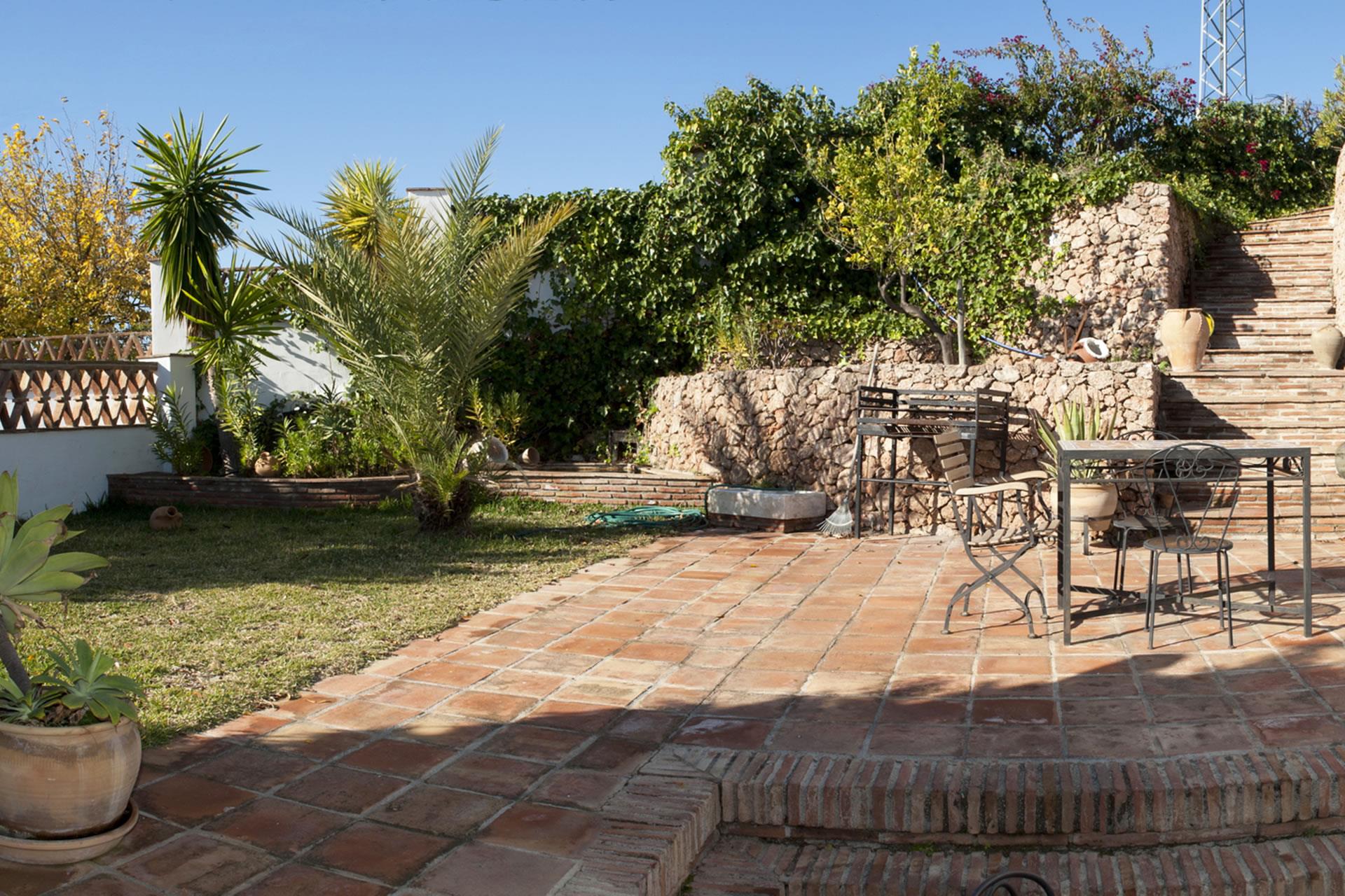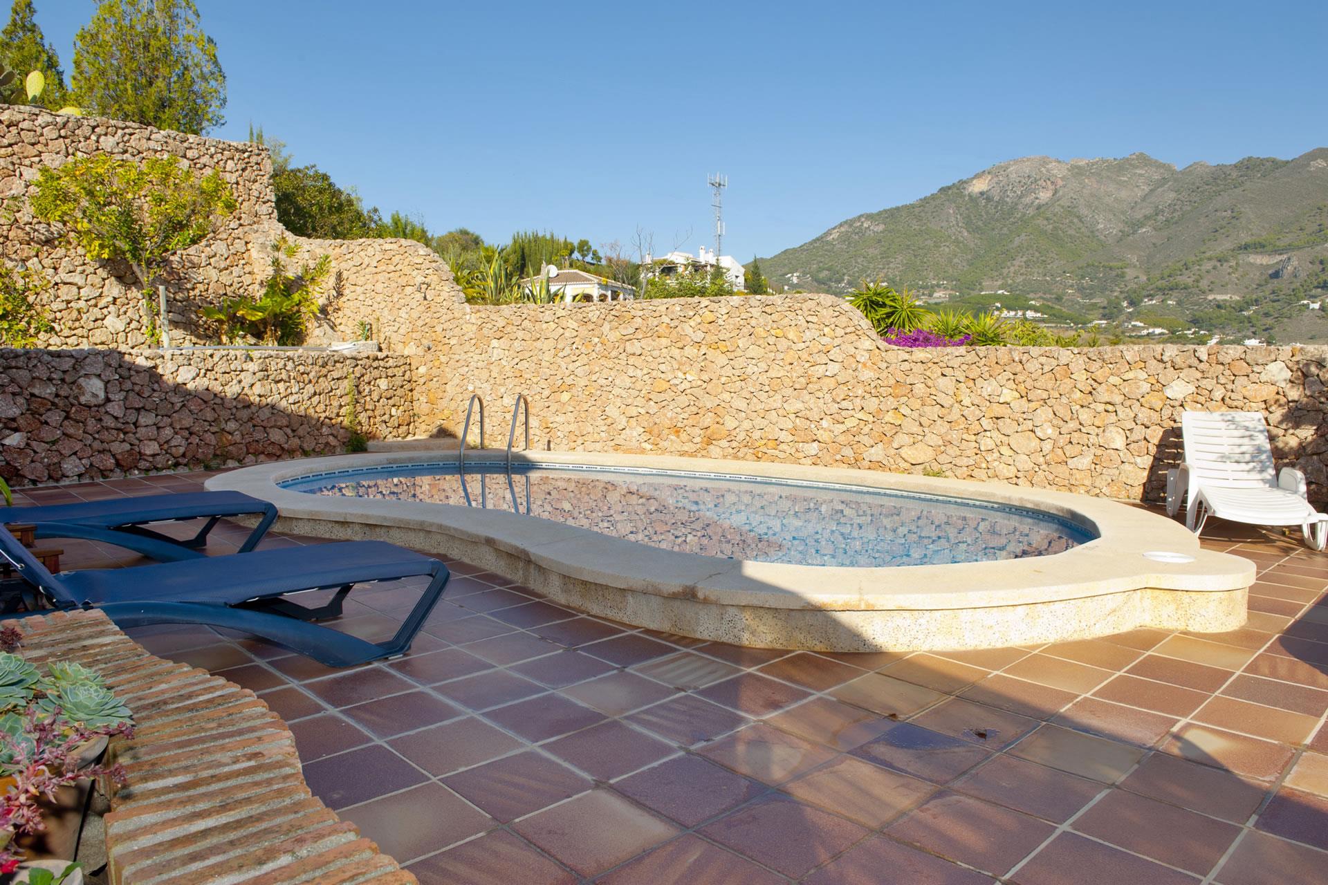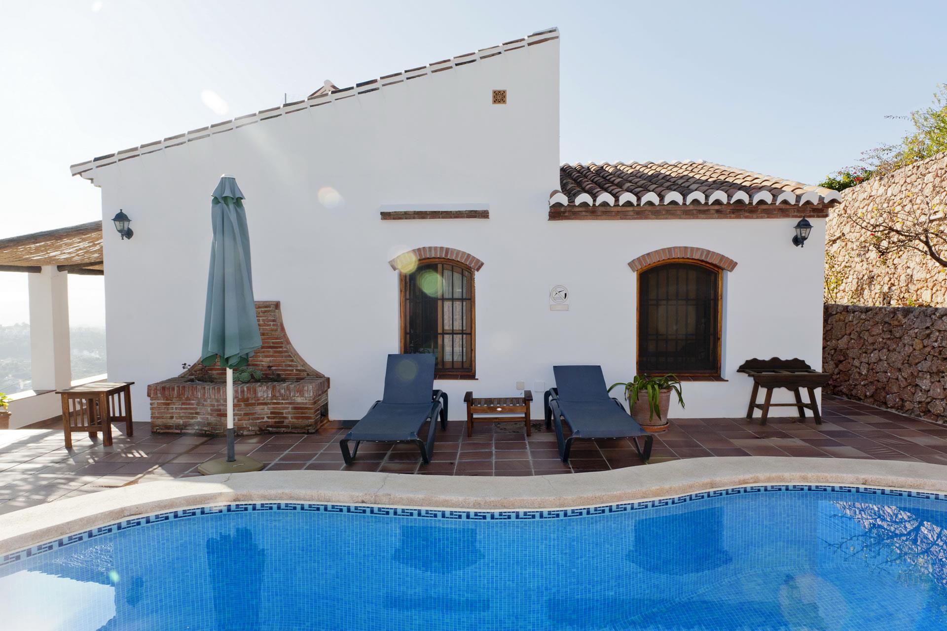 Situada en el campo a tres kilómetros y medio de Frigiliana, esta casita se ofrece como un confortable y apacible retiro para una pequeña familia. El jardín, que incluye una pequeña zona de césped y un estanque en el acceso a la puerta principal, está plantado con flores, arbustos y árboles frutales. La piscina con forma de riñón (7 X 3 m) está emplazada en un íntimo rincón de la terraza y se complementa con una ducha, mobiliario de jardín y sombrillas para el sol. La galería de la fachada este, accesible directamente desde la zona de la piscina y también desde una puerta acristalada situada en la sala de estar, es el lugar perfecto para echarse una siesta a la sombra o para sus barbacoas. Las playas de Nerja (7,5 km) están a sólo 10-15 minutos en coche.