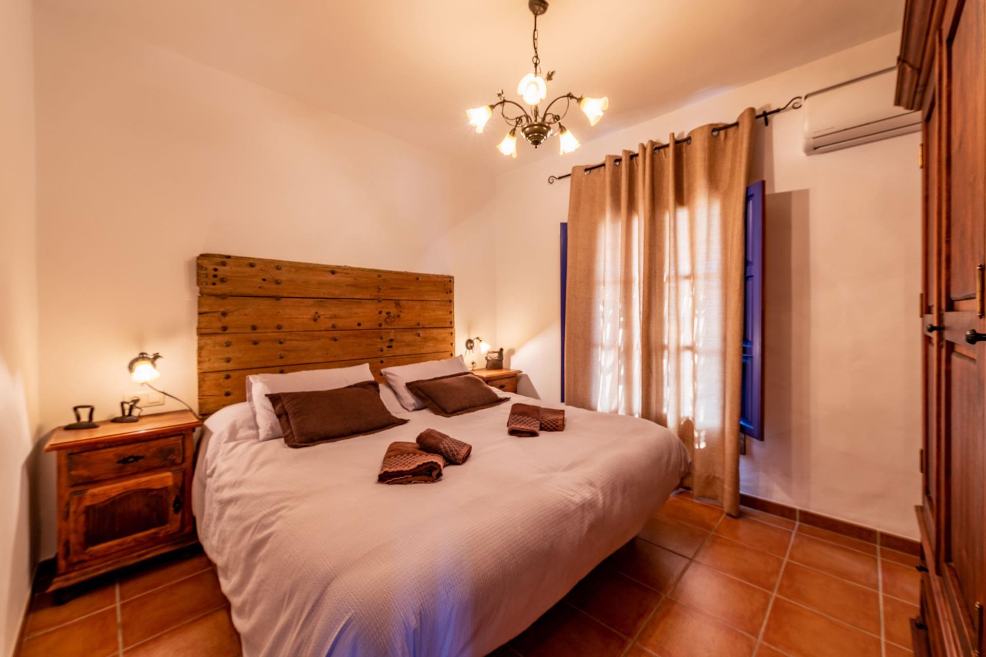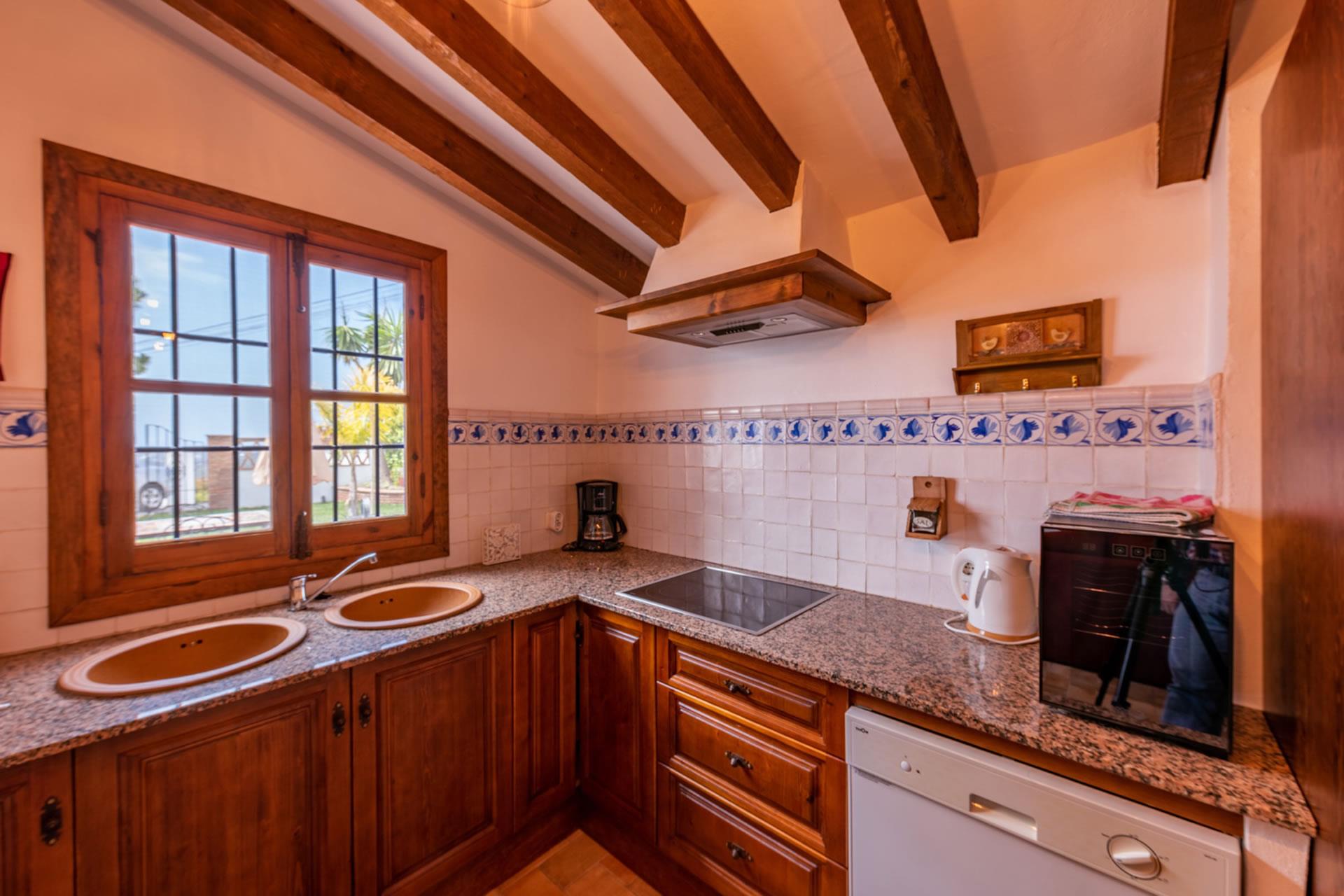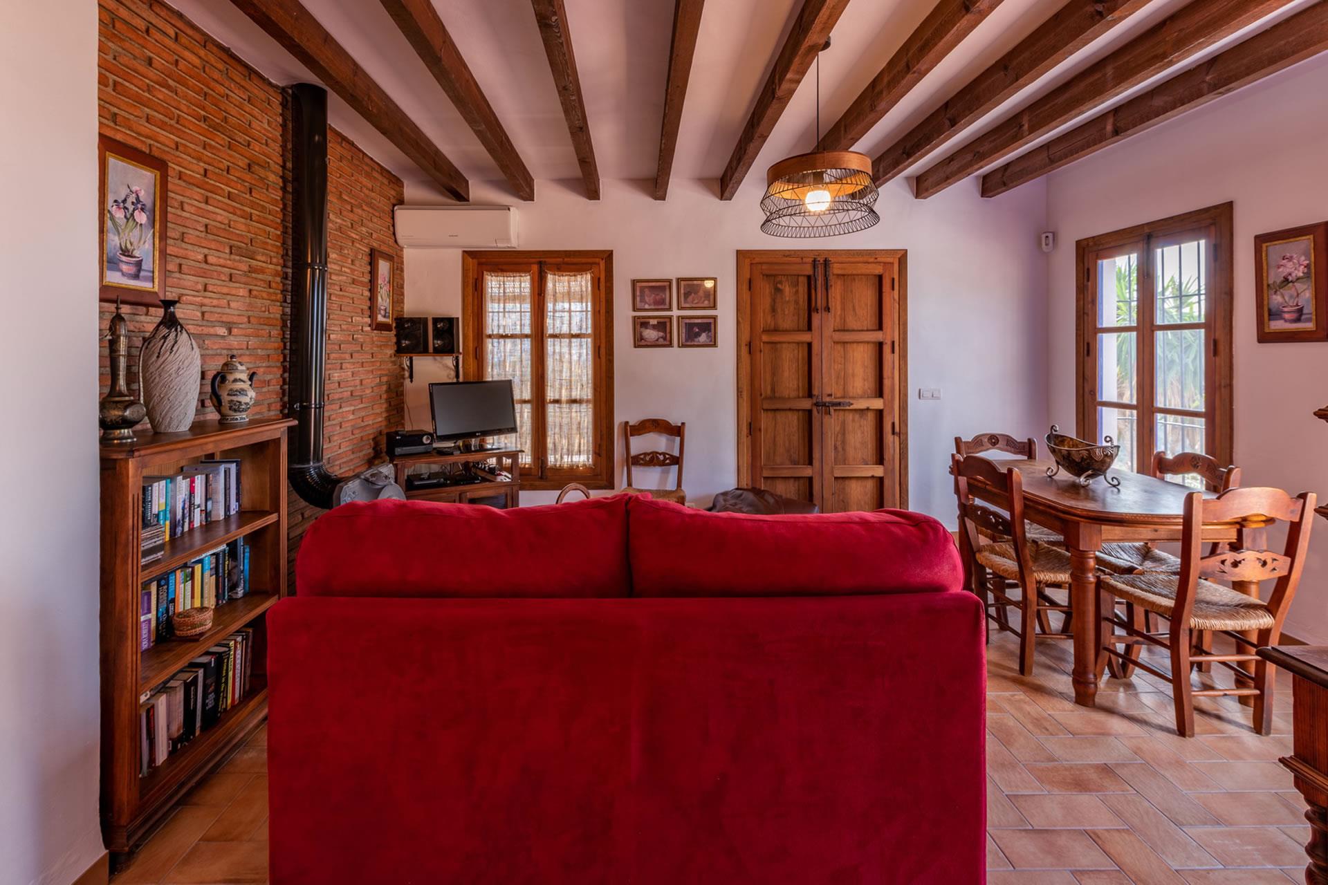 Con todas las habitaciones en la planta baja, esta casita ha sido amueblada con gran gusto y decorada al estilo rústico andaluz. La zona de vivienda se encuentra abierta a una amplia cocina y a una sala de estar con televisión, equipo musical y estufa de leña. Toda la estancia se beneficia de techos altos, dando la sensación de espacio y frescor en los calurosos días de verano. Amplios ventanales (con mosquiteras) y una puerta acristalada dan a la sombreada galería. La cocina está completamente equipada y cuenta con placa vitrocerámica de 4 fuegos, horno eléctrico, microondas, lavavajillas, frigorífico/congelador, vinoteca y cafetera. La lavadora se encuentra en un cuarto de servicio. La casita cuenta con dos dormitorios, (uno con cama de matrimonio y otro con dos camas individuales) y un cuarto de baño con ducha, WC y lavabo.