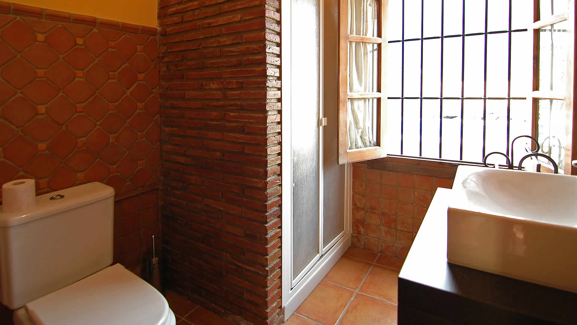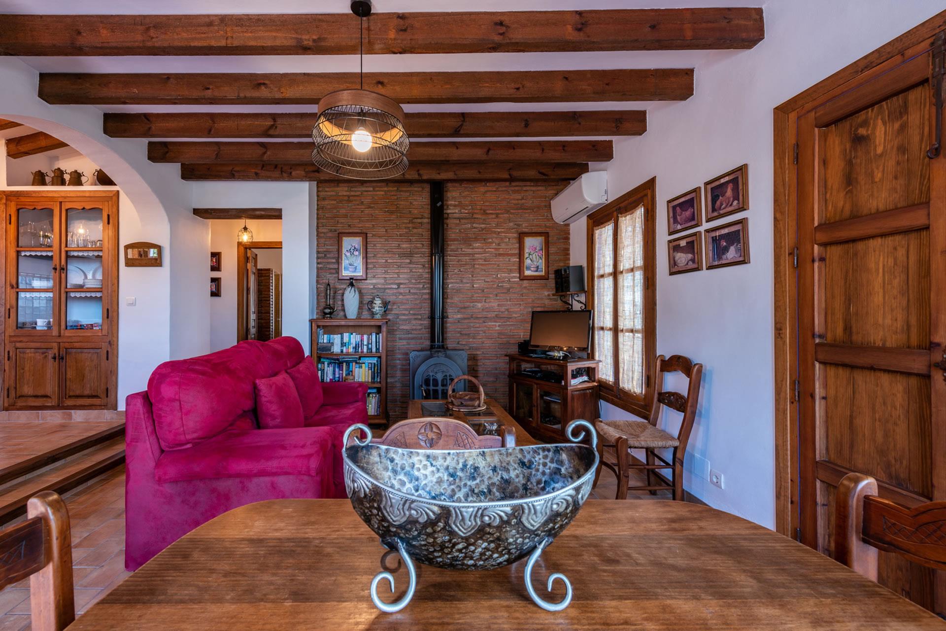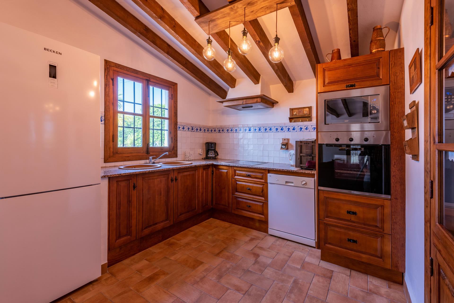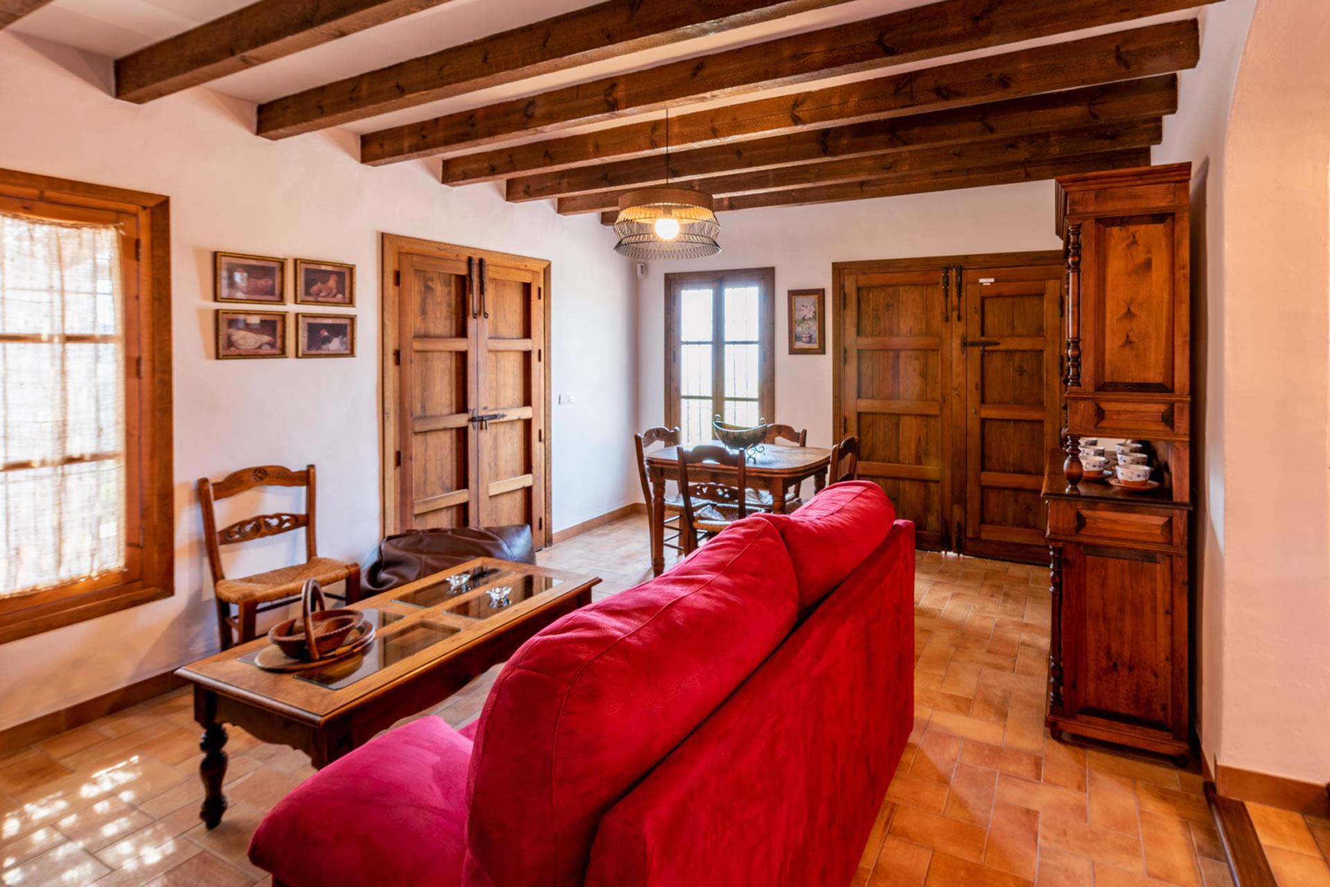 Con todas las habitaciones en la planta baja, esta casita ha sido amueblada con gran gusto y decorada al estilo rústico andaluz. La zona de vivienda se encuentra abierta a una amplia cocina y a una sala de estar con televisión, equipo musical y estufa de leña. Toda la estancia se beneficia de techos altos, dando la sensación de espacio y frescor en los calurosos días de verano. Amplios ventanales (con mosquiteras) y una puerta acristalada dan a la sombreada galería. La cocina está completamente equipada y cuenta con placa vitrocerámica de 4 fuegos, horno eléctrico, microondas, lavavajillas, frigorífico/congelador, vinoteca y cafetera. La lavadora se encuentra en un cuarto de servicio. La casita cuenta con dos dormitorios, (uno con cama de matrimonio y otro con dos camas individuales) y un cuarto de baño con ducha, WC y lavabo.