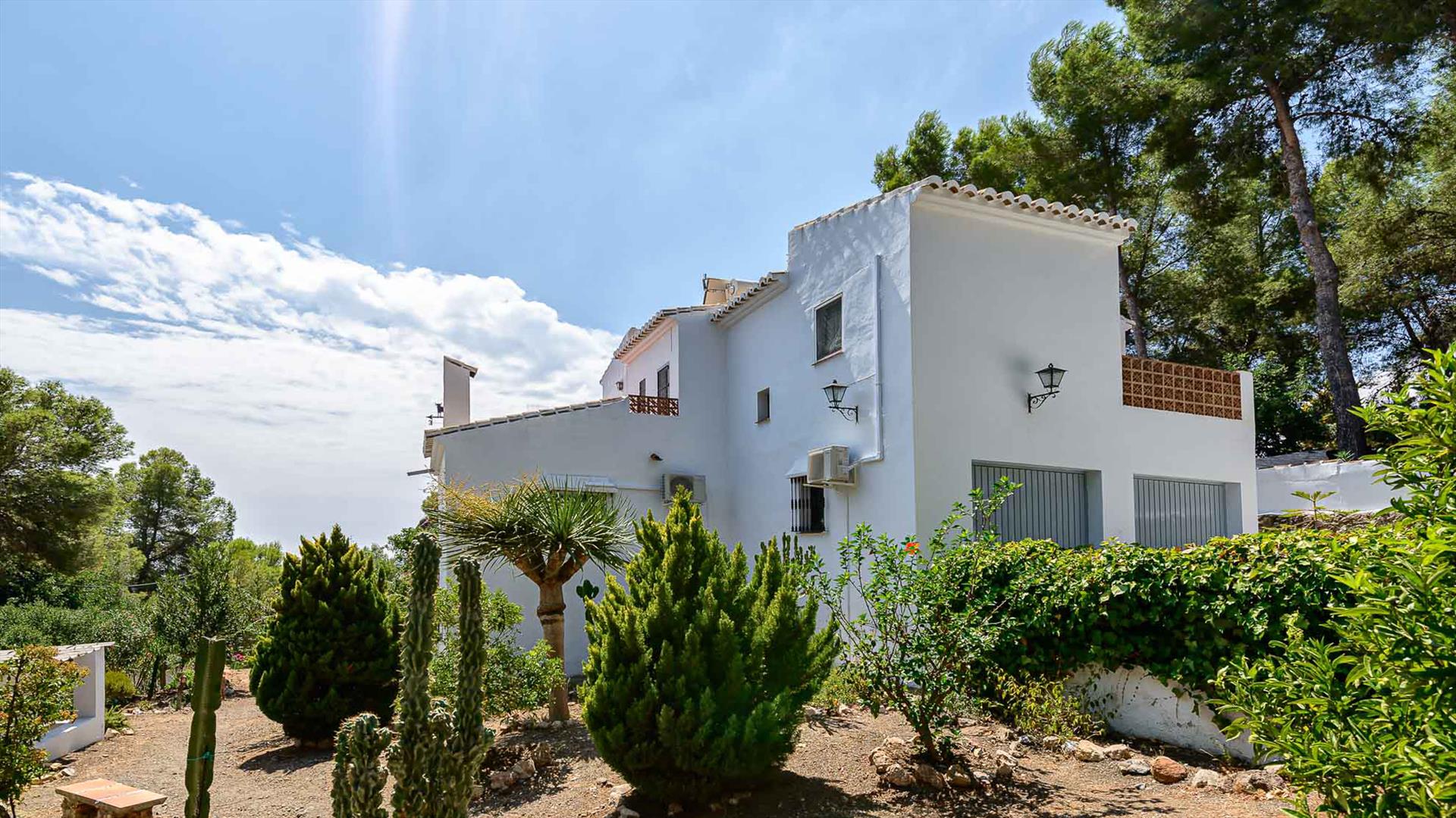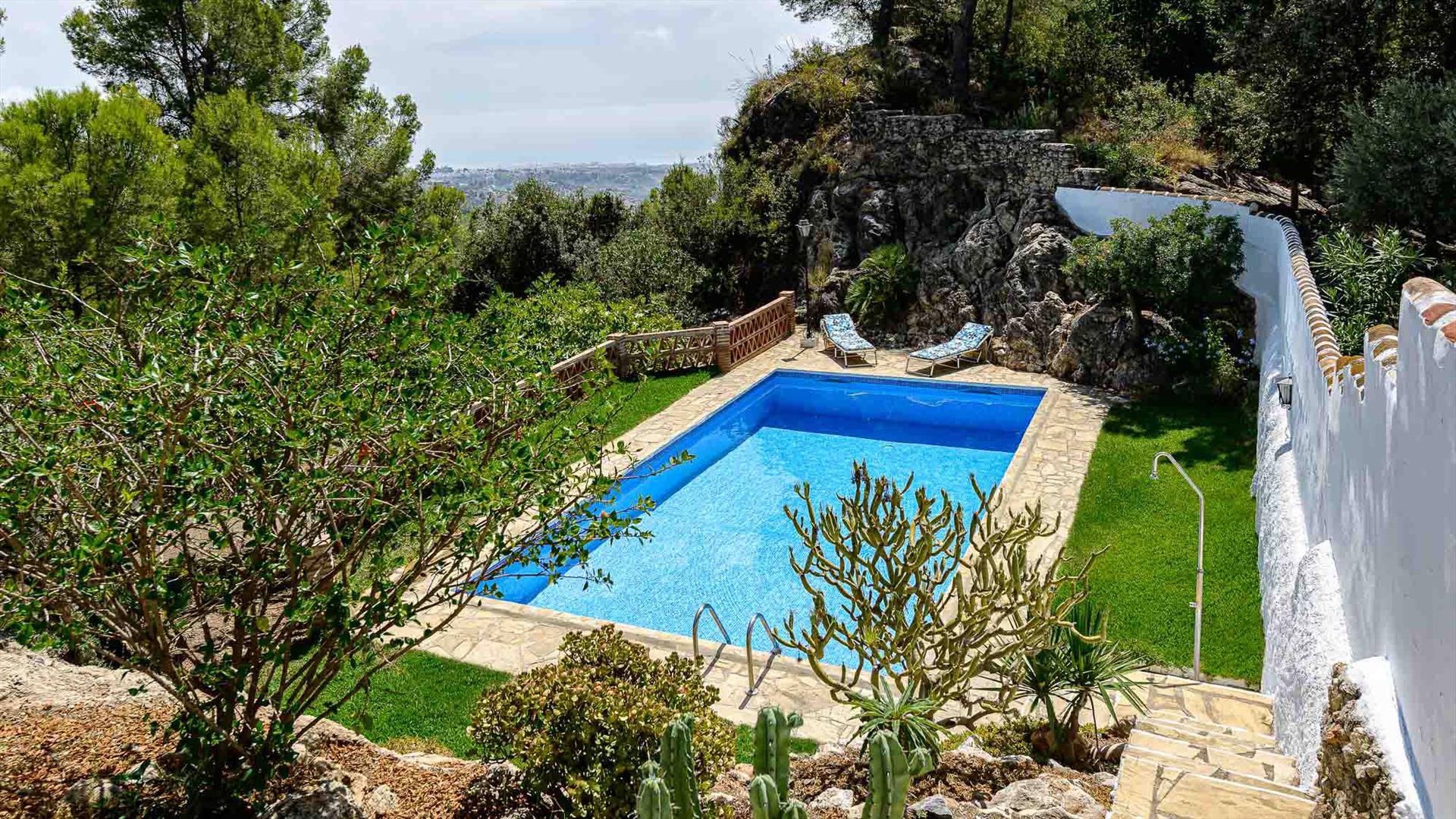 Parcela de 1.500 m2 con terrazas, jardines, césped y piscina de 50 m2. Todo con maravillosas vistas al mar y la montaña.