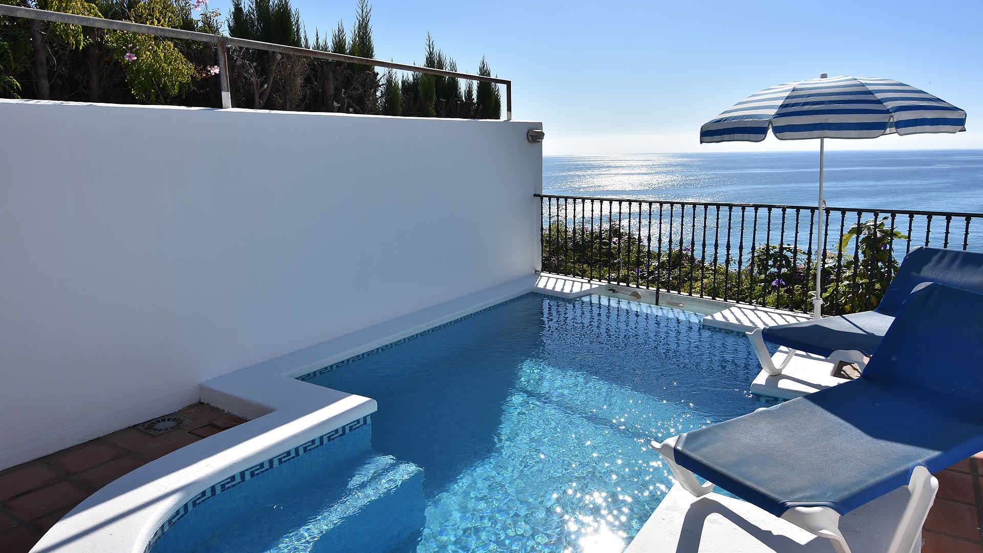 Imagínese salir por la puerta, girar a su izquierda, caminar ochenta metros y...¡Tenderse en la playa! Otra buenísima alternativa es la de sentarse en una terraza y pedir una sangría bien fría! Todo es posible. Esta maravillosa casa esta emplazada en la calle Carabeo, en el mismo corazón de Nerja. Disfrutará de su propia piscina privada con terraza soleada mientras goza de magníficas vistas a la playa y al Mediterráneo. Antes de que siga leyendo me gustaría informarle de que esta casa está acondicionada para un máximo de cuatro adultos y dos niños.