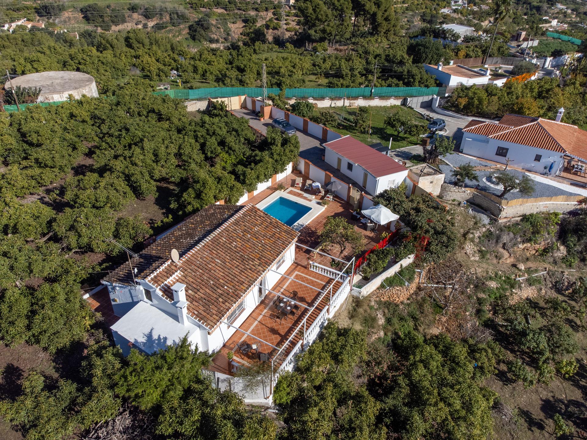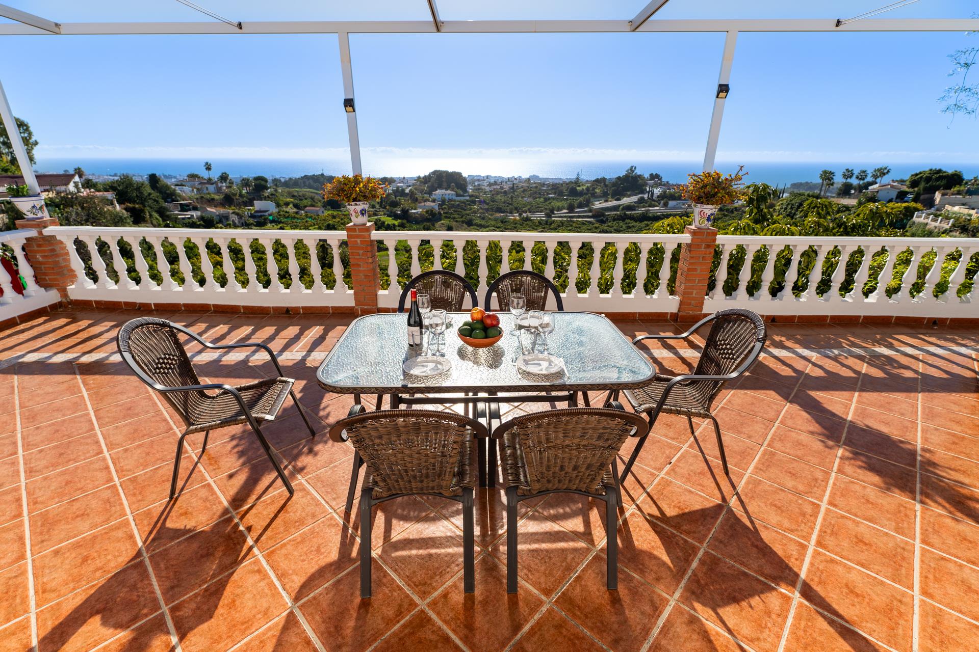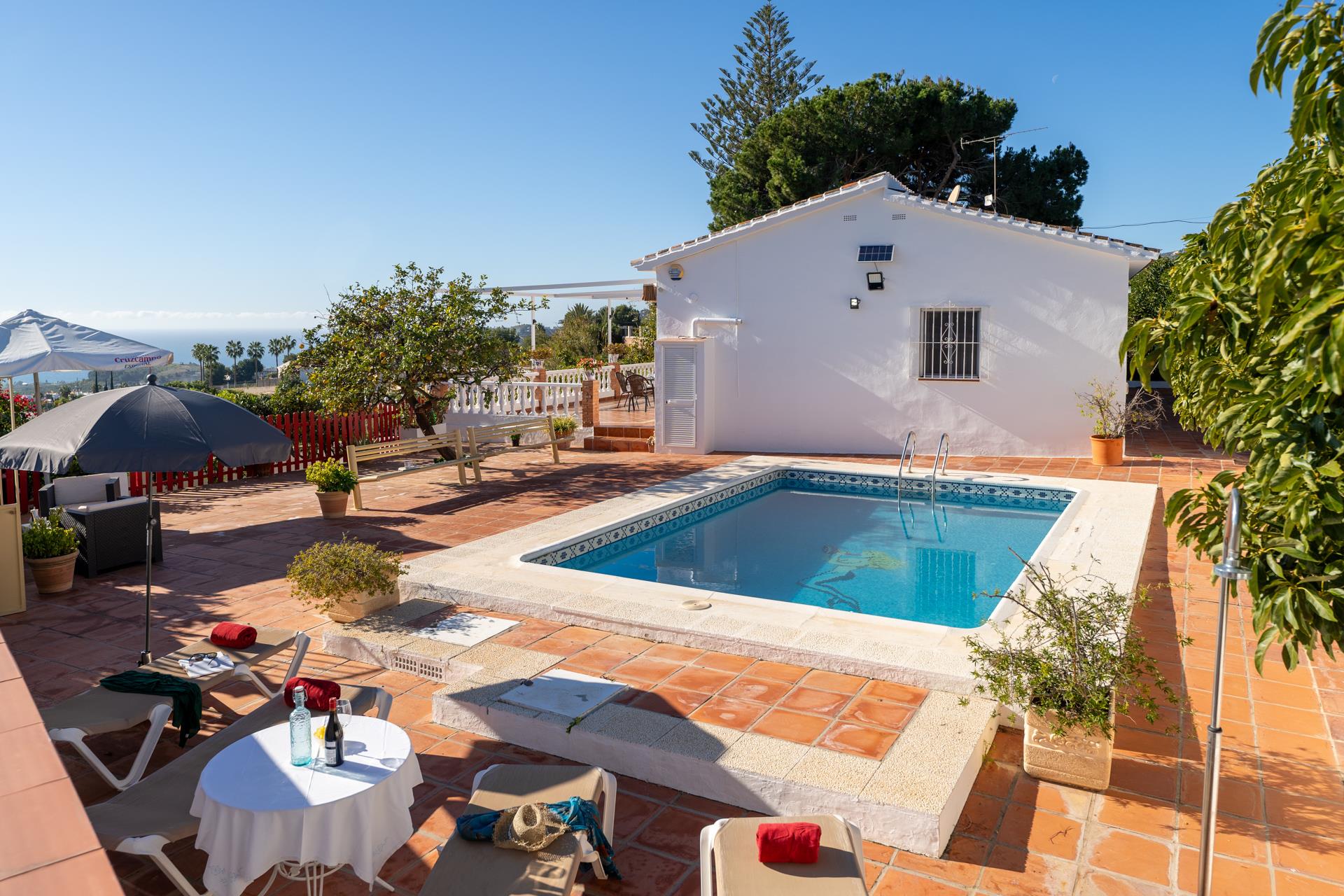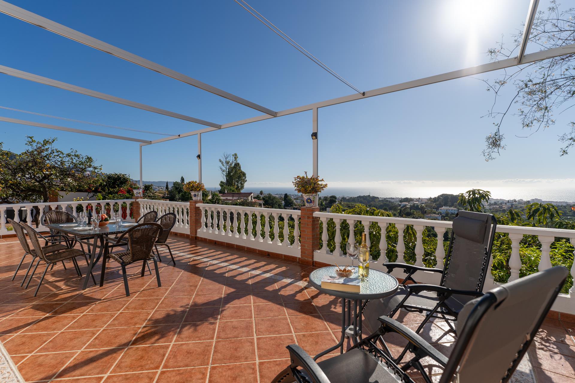 Esta villa está situada en la zona de Tablazos, a igual distancia de Nerja (3km) y Frigiliana, ambas a sólo 5 minutos en coche. Aquí disfrutará de lo mejor que le puede ofrecer el campo con los servicios de la ciudad y los placeres de la playa. La amplia terraza delantera es uno de sus mayores atractivos y ofrece impresionantes vistas sobre Nerja y el mar ─ es aquí donde disfrutará de sus comidas al aire libre (hay barbacoa). La piscina privada (7m x 4m ; 1,5m - 2m de profundidad) dispone de tumbonas y ofrece las mismas vistas. A la espalda de la casa, una entrada conduce a un huerto de aguacates con algún limonero donde los huéspedes pueden coger las frutas para su propio consumo.