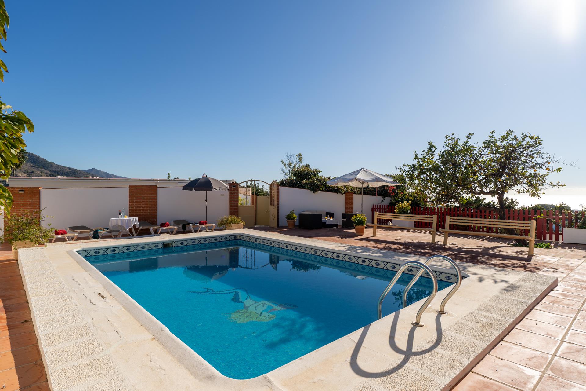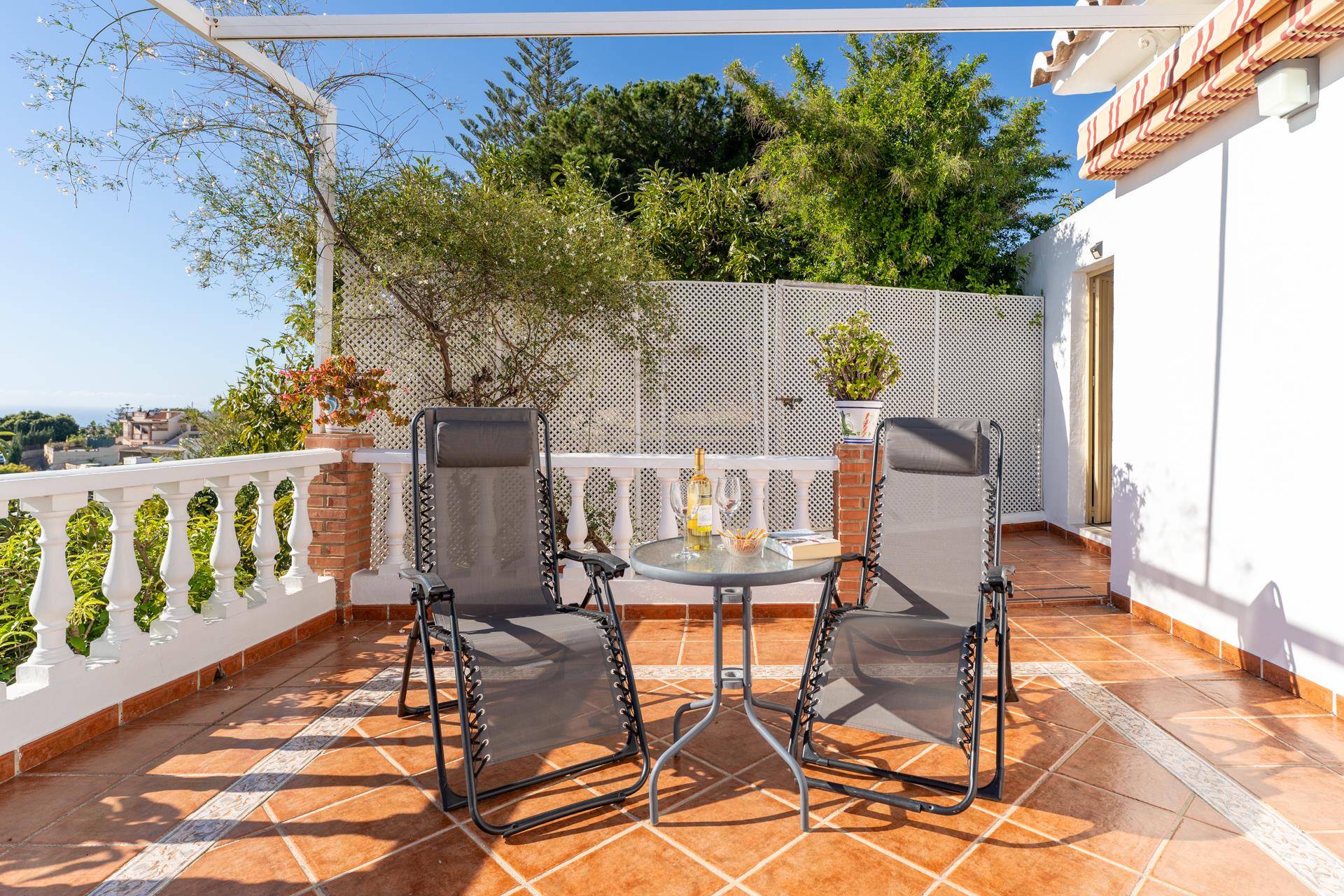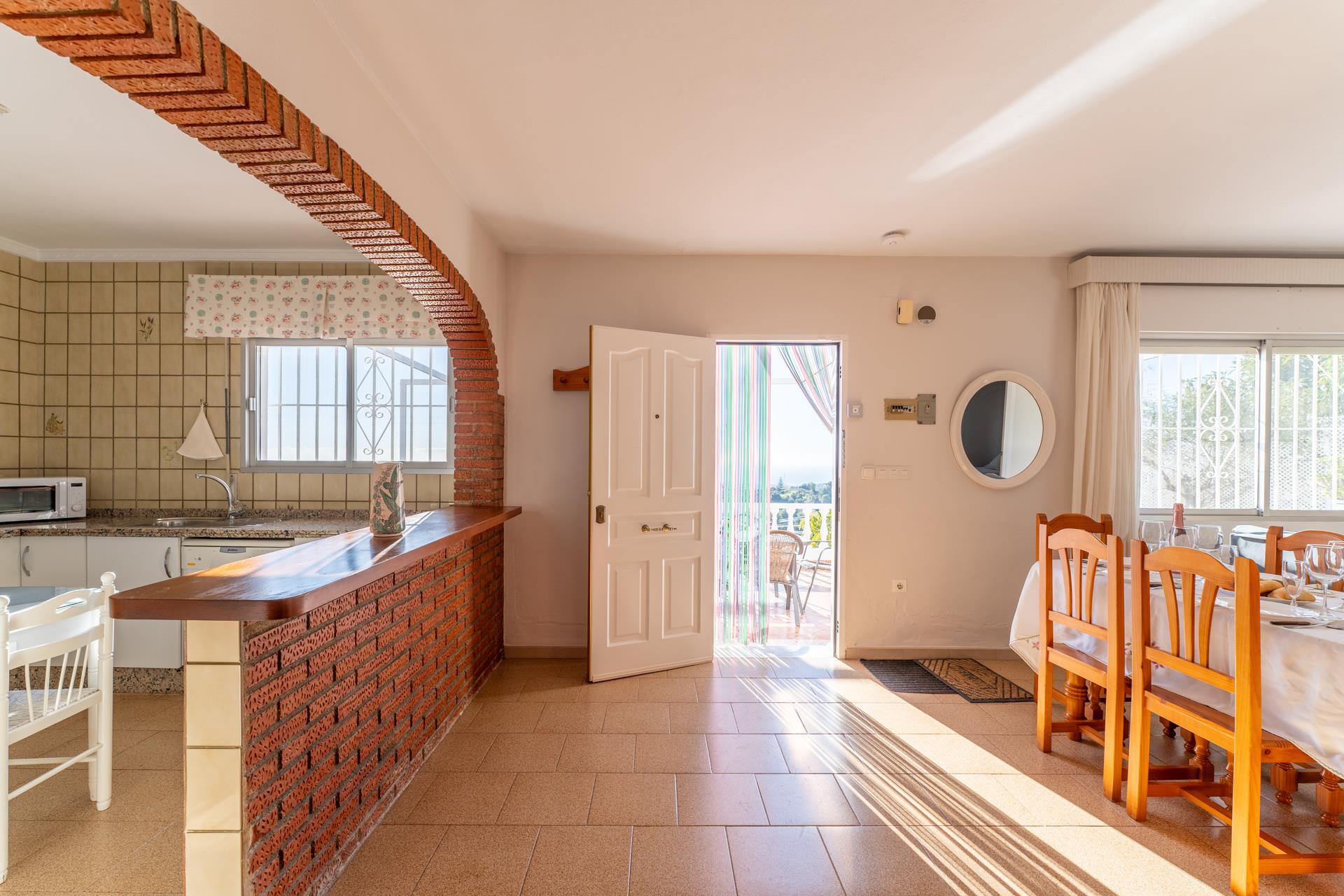 Esta villa está situada en la zona de Tablazos, a igual distancia de Nerja (3km) y Frigiliana, ambas a sólo 5 minutos en coche. Aquí disfrutará de lo mejor que le puede ofrecer el campo con los servicios de la ciudad y los placeres de la playa. La amplia terraza delantera es uno de sus mayores atractivos y ofrece impresionantes vistas sobre Nerja y el mar ─ es aquí donde disfrutará de sus comidas al aire libre (hay barbacoa). La piscina privada (7m x 4m ; 1,5m - 2m de profundidad) dispone de tumbonas y ofrece las mismas vistas. A la espalda de la casa, una entrada conduce a un huerto de aguacates con algún limonero donde los huéspedes pueden coger las frutas para su propio consumo.