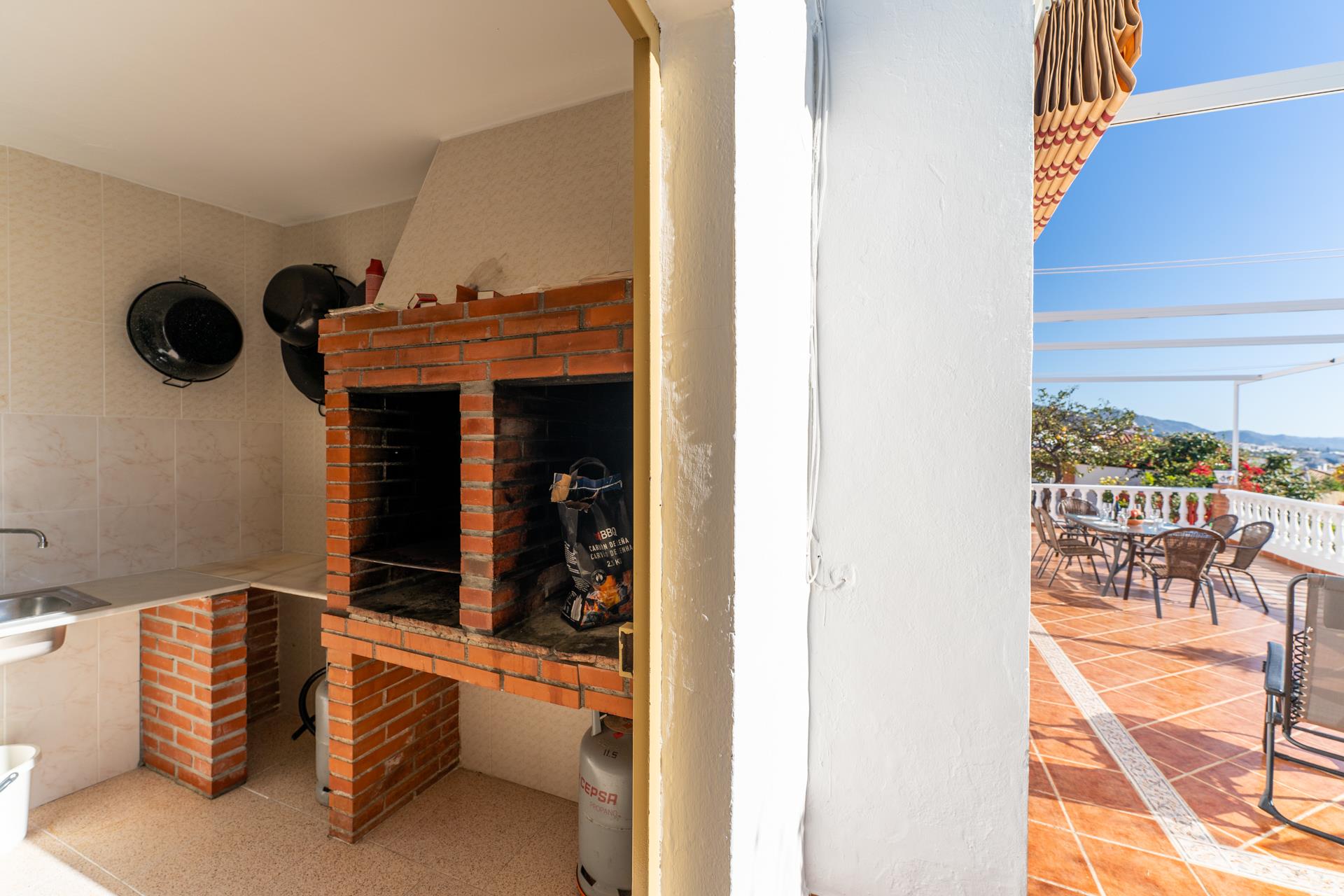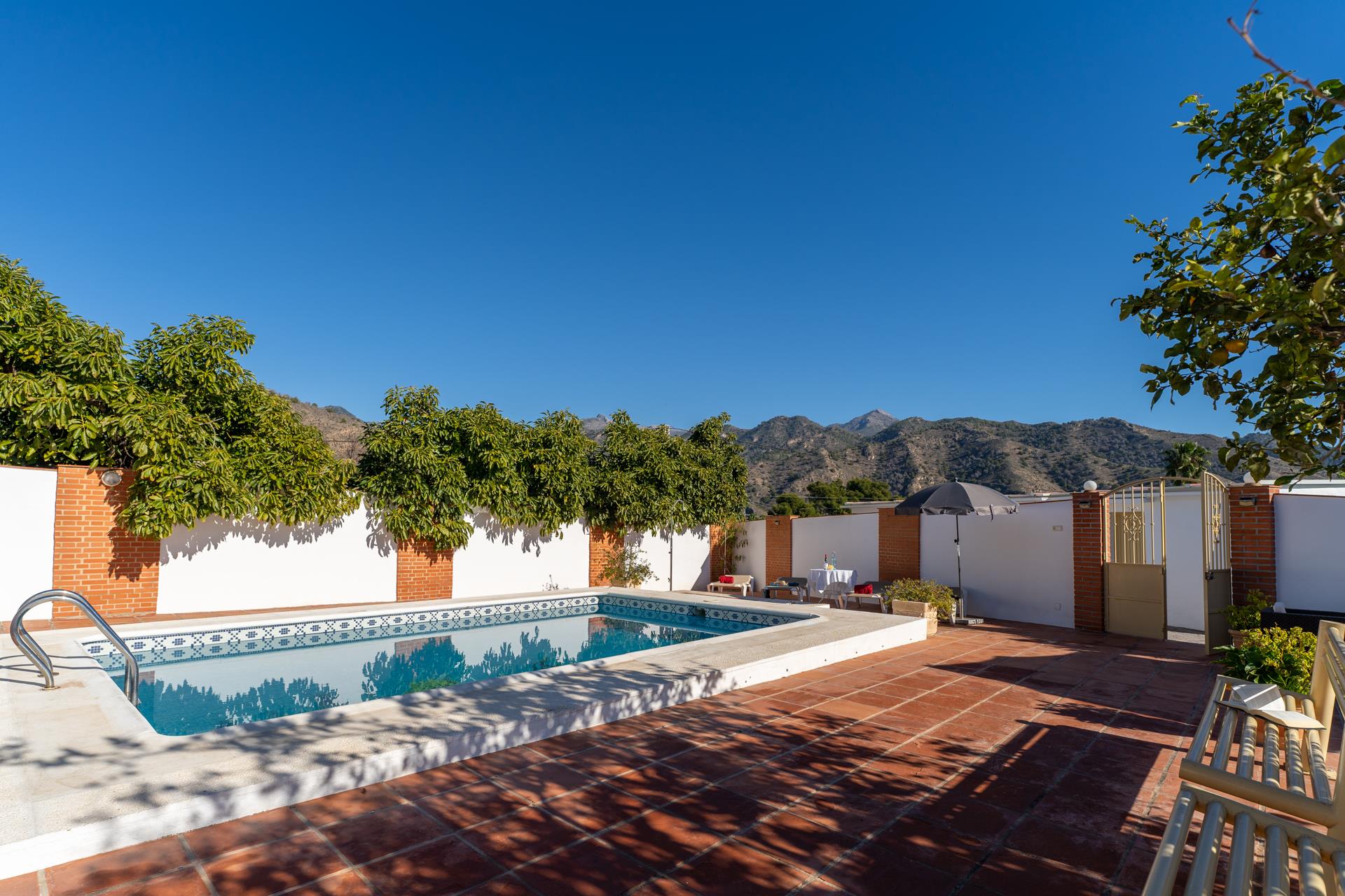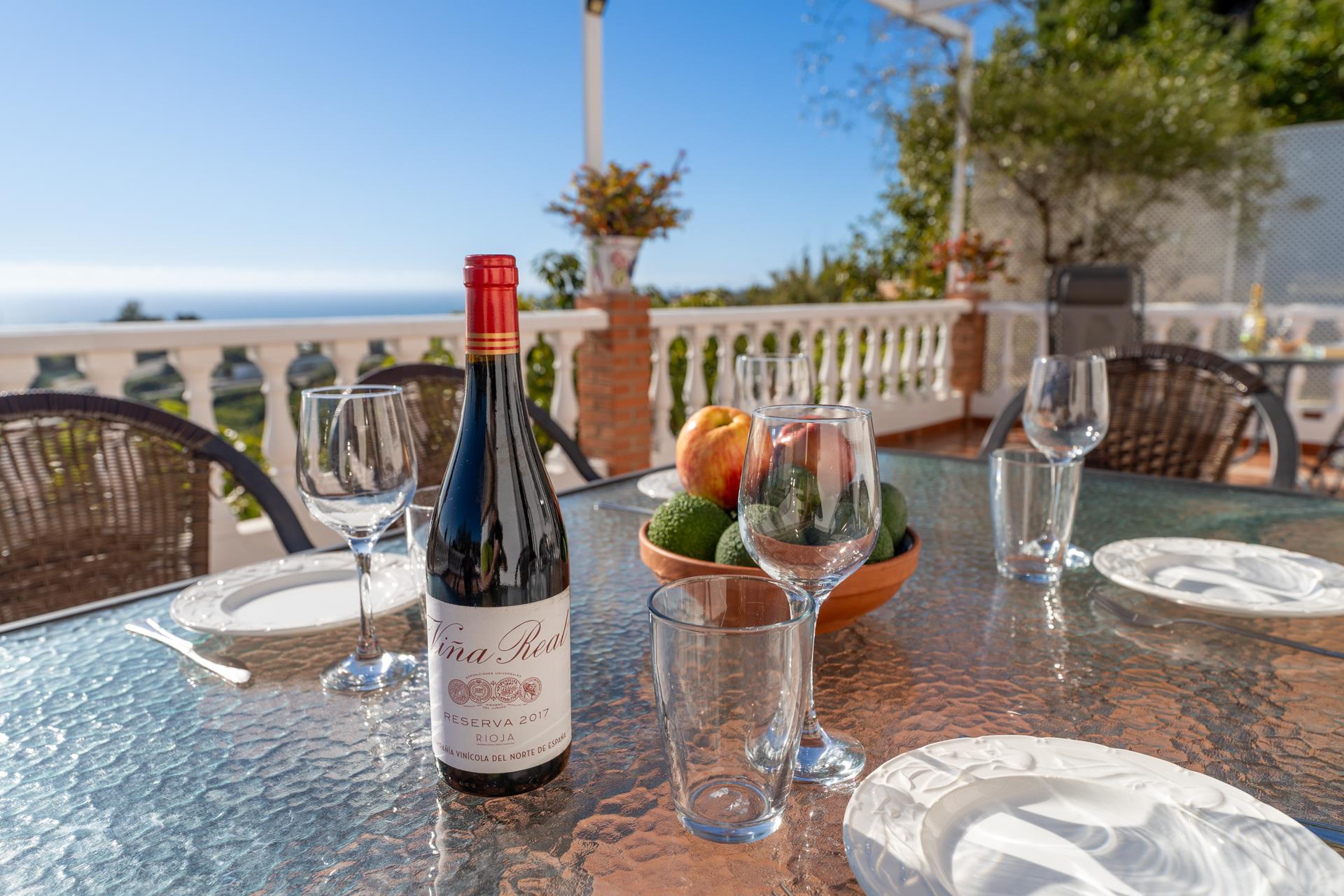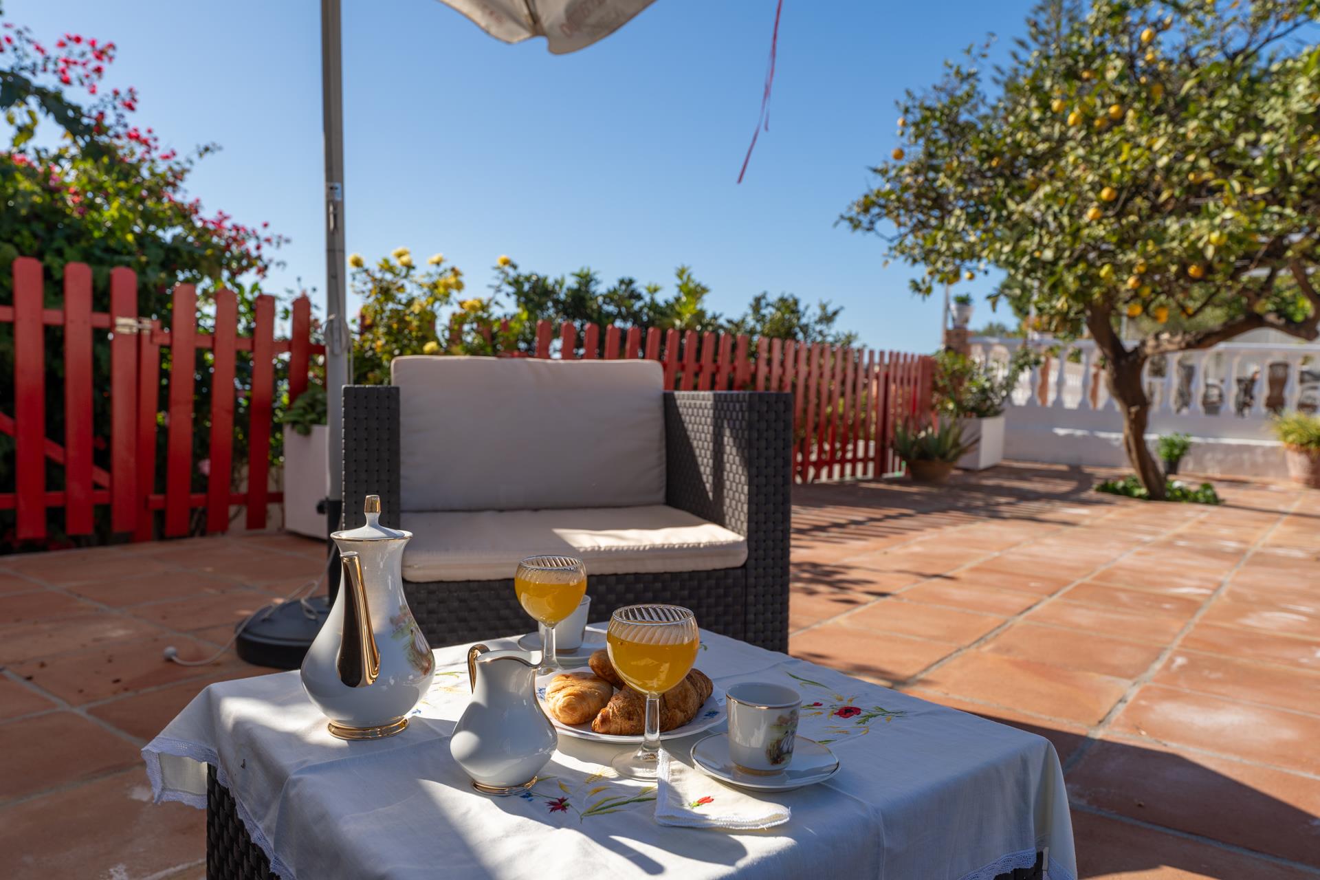 Esta villa está situada en la zona de Tablazos, a igual distancia de Nerja (3km) y Frigiliana, ambas a sólo 5 minutos en coche. Aquí disfrutará de lo mejor que le puede ofrecer el campo con los servicios de la ciudad y los placeres de la playa. La amplia terraza delantera es uno de sus mayores atractivos y ofrece impresionantes vistas sobre Nerja y el mar ─ es aquí donde disfrutará de sus comidas al aire libre (hay barbacoa). La piscina privada (7m x 4m ; 1,5m - 2m de profundidad) dispone de tumbonas y ofrece las mismas vistas. A la espalda de la casa, una entrada conduce a un huerto de aguacates con algún limonero donde los huéspedes pueden coger las frutas para su propio consumo.