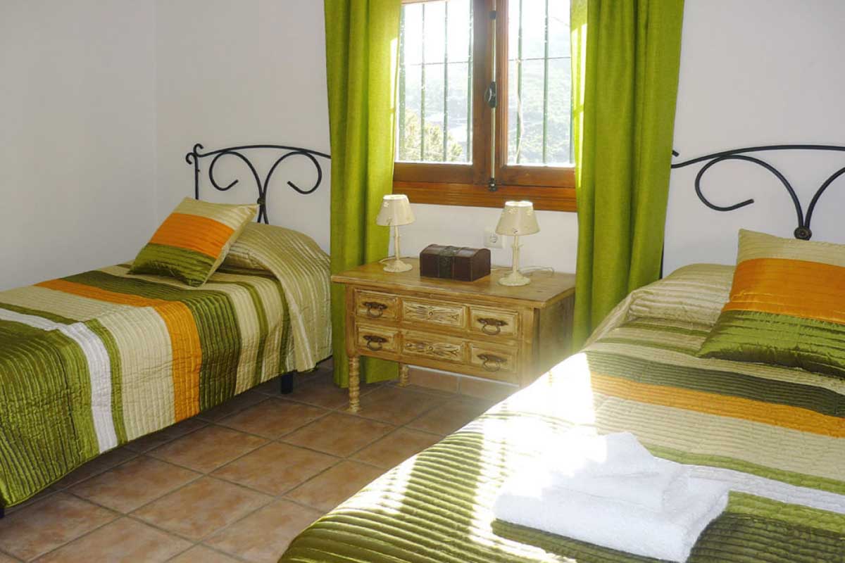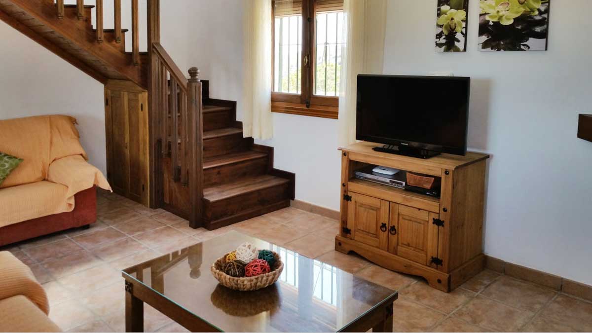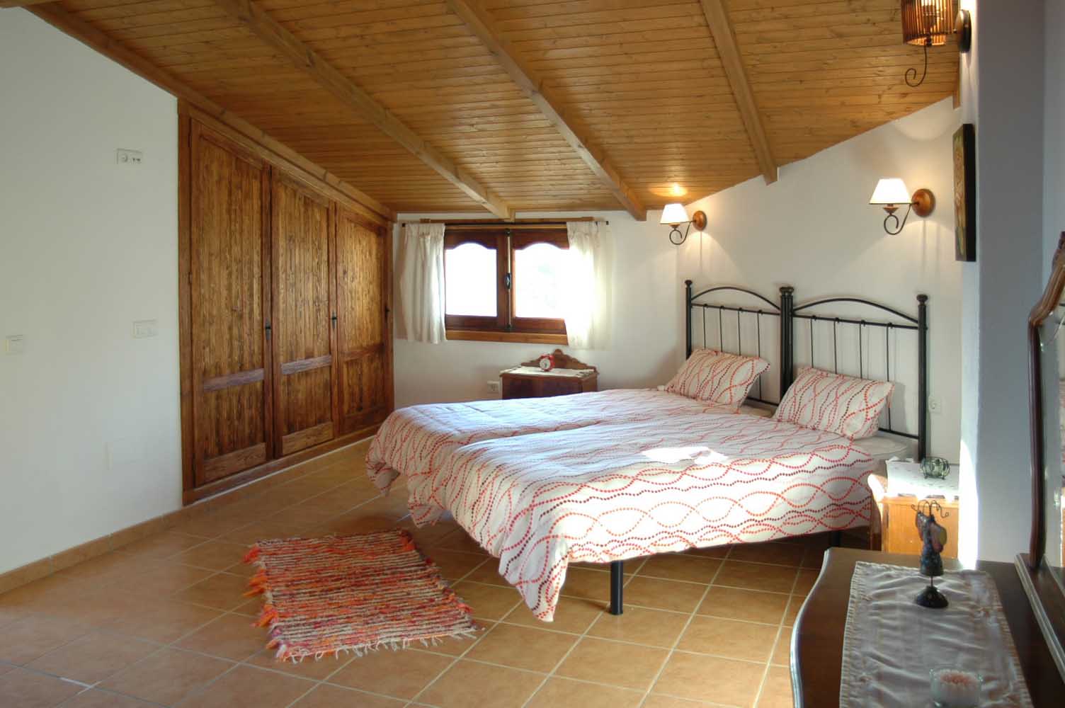 La casa tiene las habitaciones divididas entre 2 plantas. El salón es muy cómodo y realizado en un estilo rústico y dispone de chimenea, mesa comedor, sofá, 2 butacas, mesita y televisión por satélite. La cocina, en plan-abierto, esta equipada con vitrocerámica, horno, microondas, lavavajillas y frigorífico. La lavadora se encuentra en un cuarto junto a la terraza. Los dormitorios son muy agradables con colores alegres. El dormitorio principal es muy espacioso y romántico, equipada con cama de matrimonio y baño ensuite con bañera con ducha, wc y lavabo. Los otros dormitorios tienen 2 camas individuales cada uno. Comparten un cuarto de ducha con wc y lavabo.
