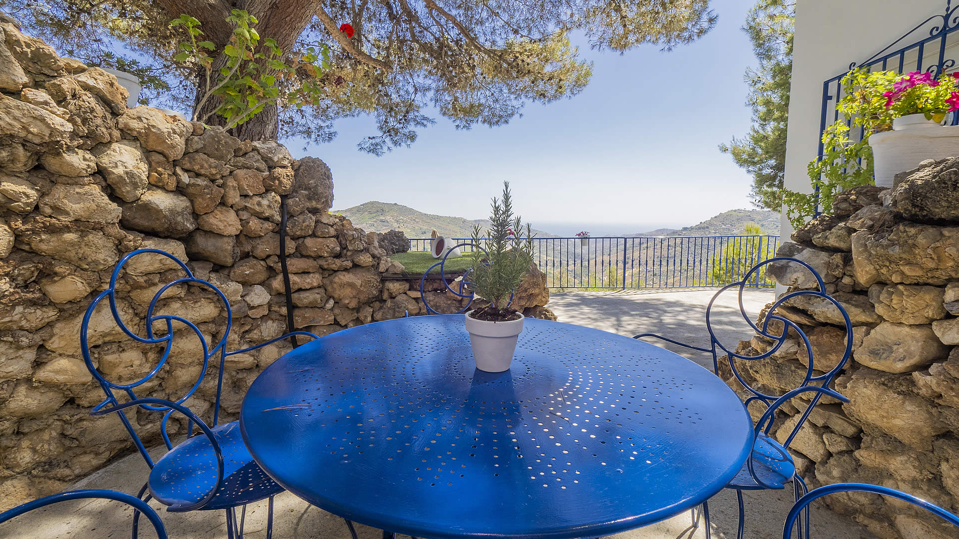 Rodeada de encinas centenarias, olivos y pinos y mirando al mar se encuentra esta coqueta y romántica propiedad. Construida sobre una roca en lo alto de una colina, tiene una situación privilegiada desde la cual se domina el paisaje de montañas de la Sierra de Cómpeta con casas a lo lejos en un entorno plenamente rural. Desde las zonas exteriores de la piscina y la terraza, a modo de gran mirador, brinda unas vistas extraordinarias de este escenario con el Mediterraneo de fondo. Hay una pequeña zona bajo la sombra de un pino donde sentarse mientras se disfruta de una siesta o leyendo un buen libro.